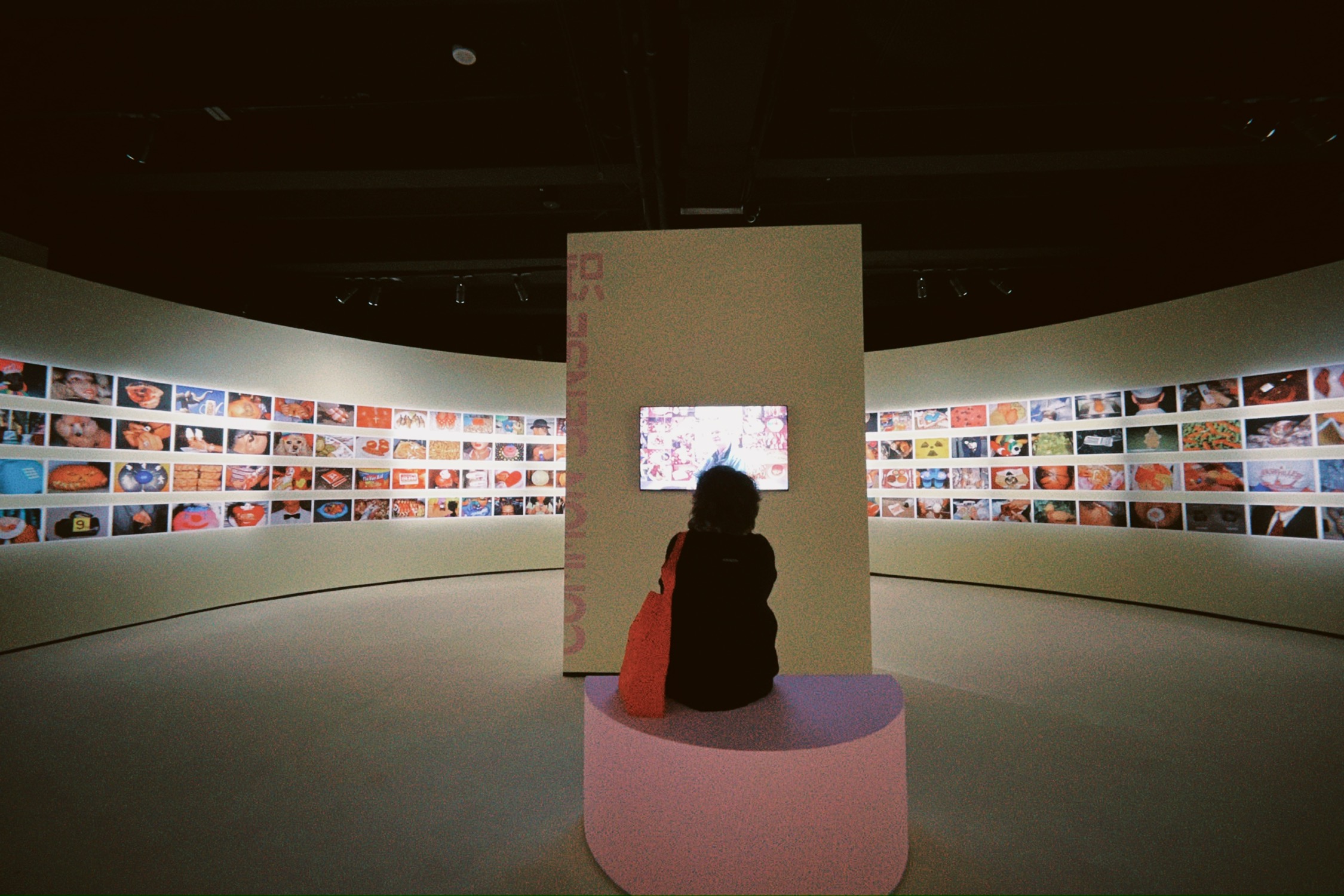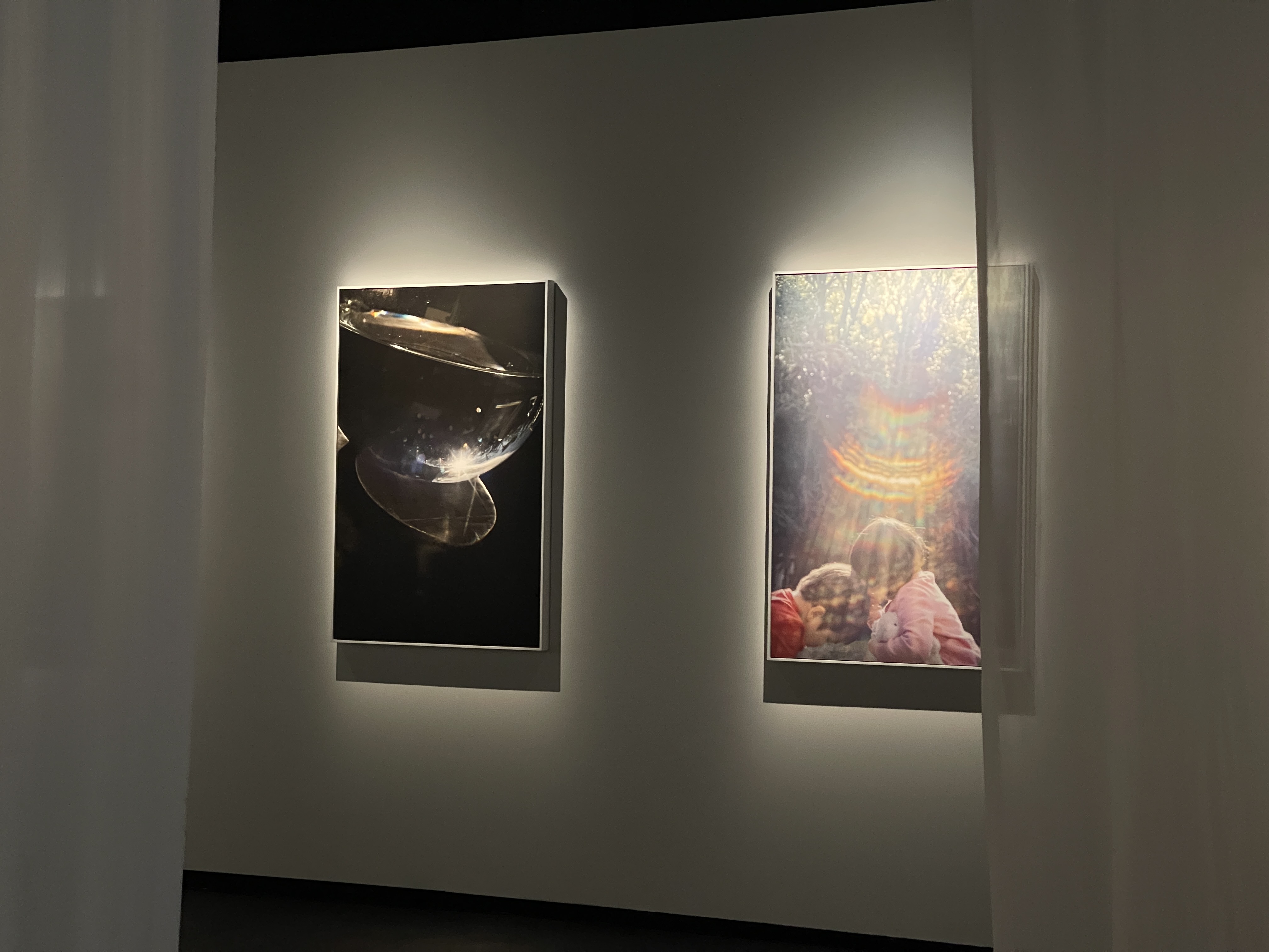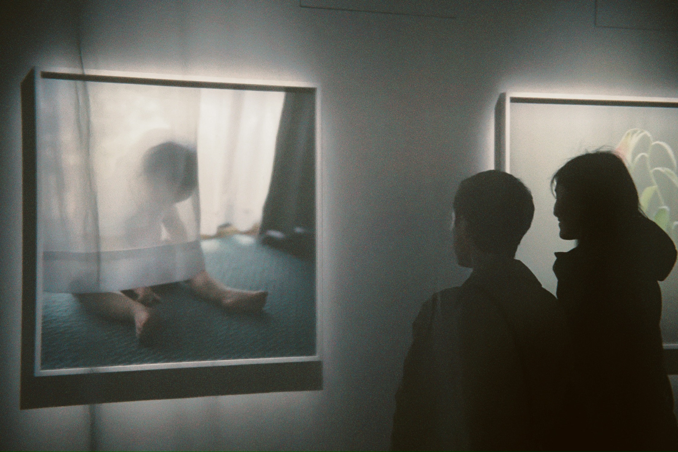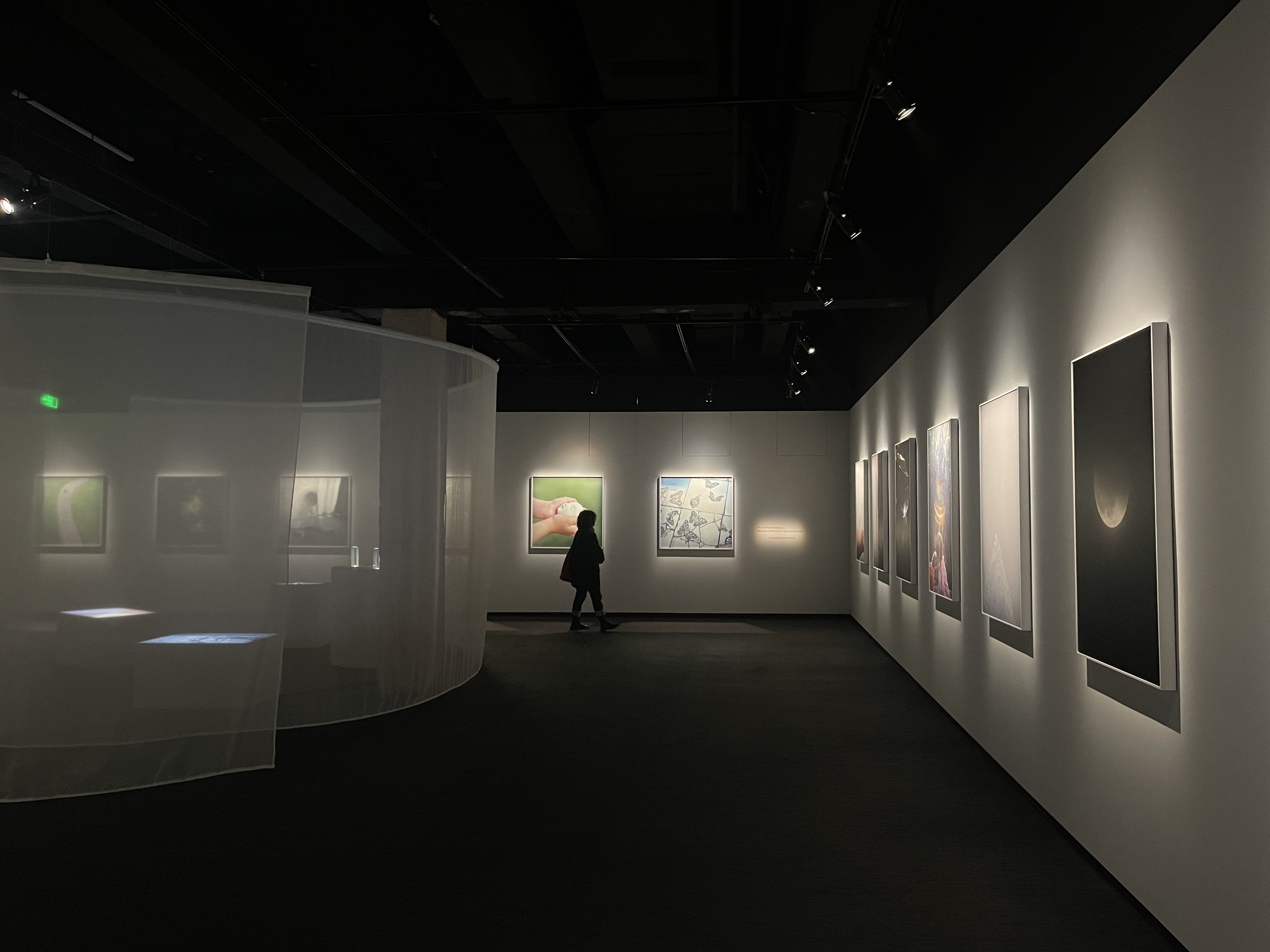展览布置也颇具巧思,半透明的薄纱与灯箱设计,布置在展厅中央,给观者内外两种观看方式,同时也有一种置身母体的感受,安全、沉浸。