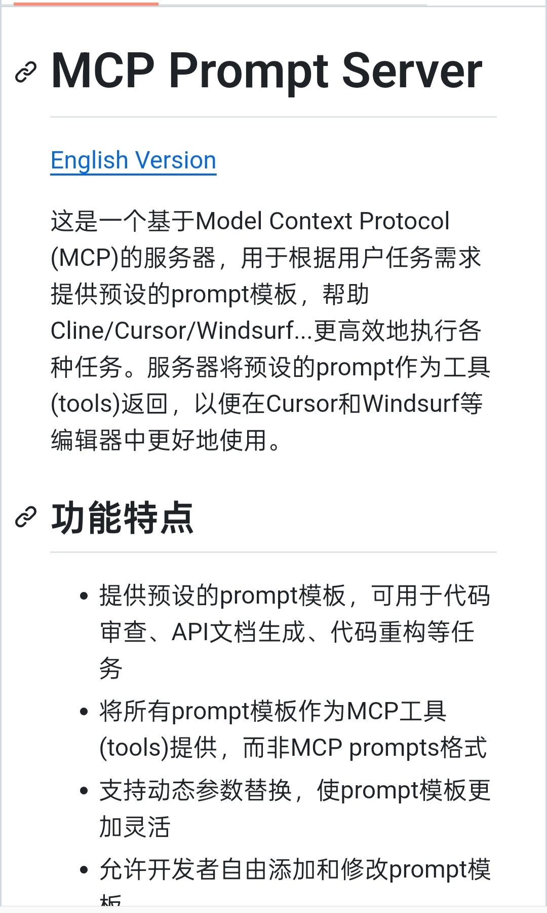 想到做这个tool,的出发点是,我发现mcp的文档介绍中,mcp除了能提供tools,还能提供内置prompt,但是很可惜,cursor,windsurf,cline 各家好像都没有支持。所以我想到,其实tool也无非是返回content内容,我只需要把prompt当content返回就行。