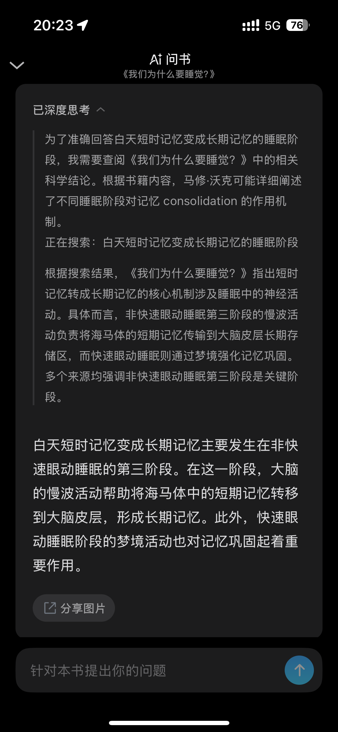 最近对微信读书 AI 问书的用法,对于已经看过的实用科普书籍,比如《我们为什么要睡觉》,看完之后有些细节忘了,就点进来“AI 问书”直接把自己的问题问下,然后 AI 就直接回答了,不用再自己想着关键词去 by 段落搜索了