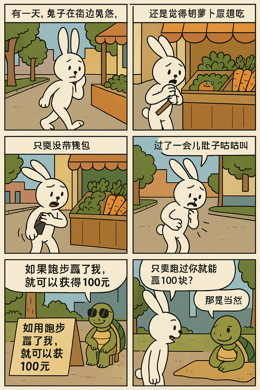 在肚子的“鼓励”下,兔子走到了乌龟面前开始问道:你这写的什么意思,只要跑过你就能赢100块?