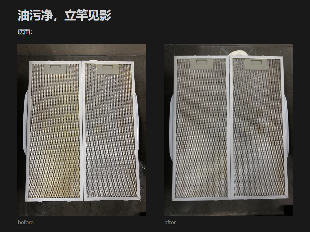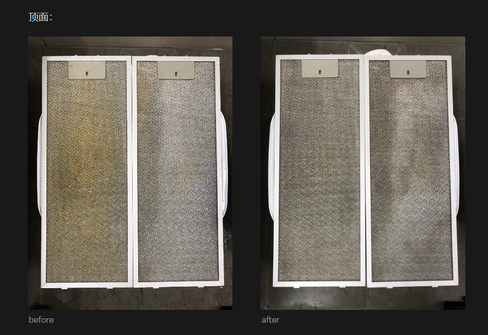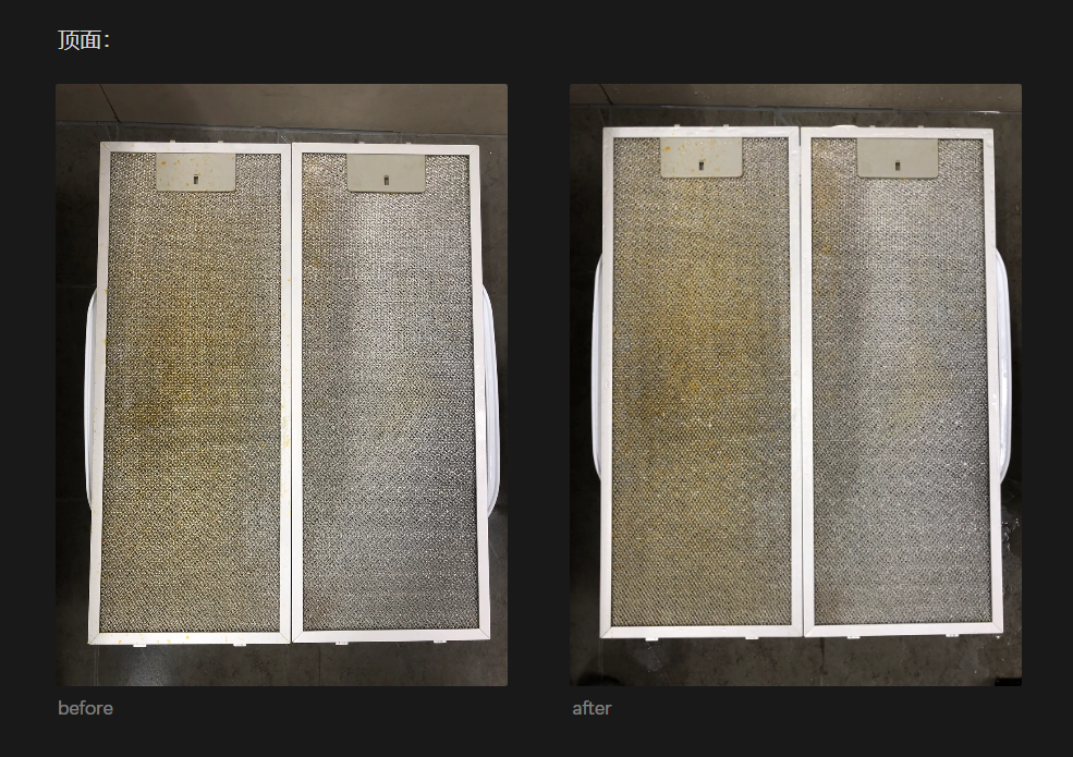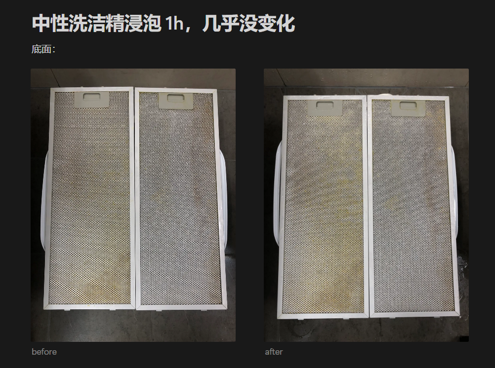 - 碱性油污净理论上不建议用于铝制滤网,但实测发现去油污效果很好,主要影响是材质可能会发黑,仍在可接受范围内
