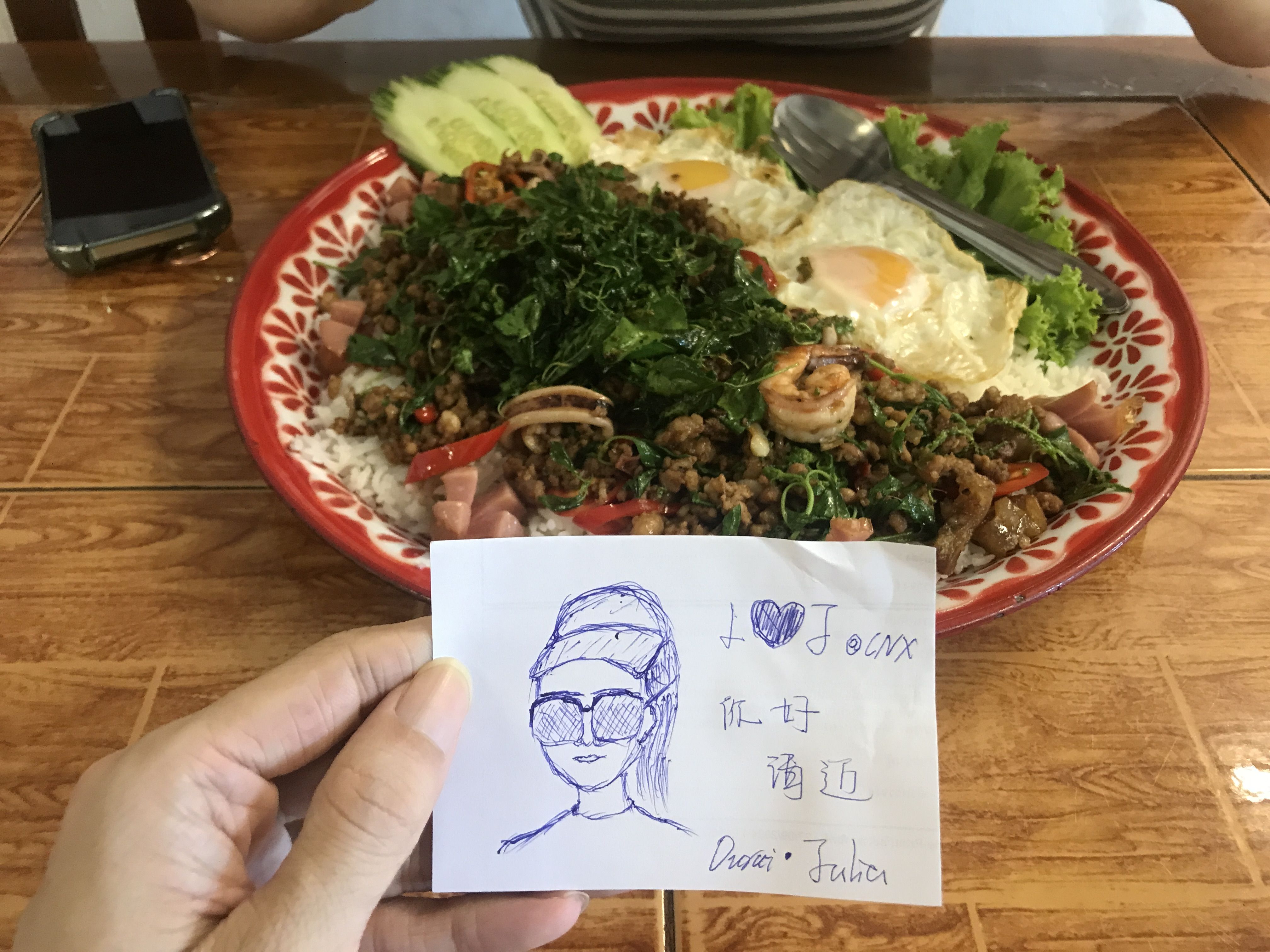 不愧是「冠军」嘎抛饭,份量很大,应该是在泰国吃过份量最大的了!跟俺家🐷愣是没吃完,不忍心浪费还打包了……😂😂😂饭花了 199 铢,打包费 5 铢。至于味道,我跟🐷都认为清迈大学的那家更好点。画了俺家🐷贴墙上,希望再来时还在~😁😁😁