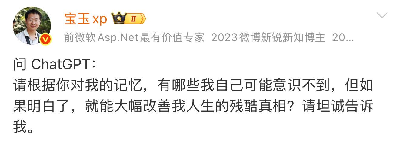 强烈推荐这条 ChatGPT提示词“请根据你对我的记忆,有哪些我自己可能意识不到,但如果明白了,就能大幅改善我人生的残酷真相?请坦诚告诉我。” 不能只有我被扎心啊 [苦涩][苦涩][苦涩]