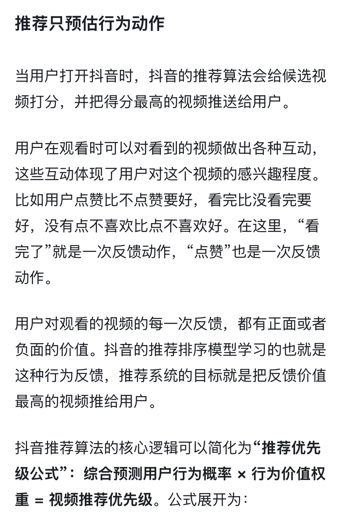 95152.douyin.com尤其是提到了抖音推荐算法的核心逻辑可以简化为“推荐优先级公式”:综合预测用户行为概率 × 行为价值权重 = 视频推荐优先级。