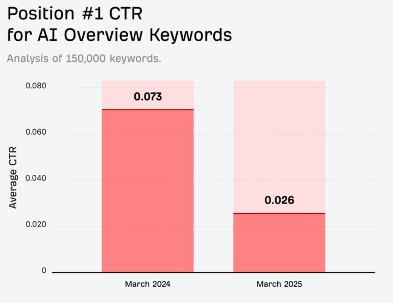 但真实数据打脸来得很快——最新的Ahrefs分析显示:AI 总结功能让头部网站点击率暴跌34.5%。
