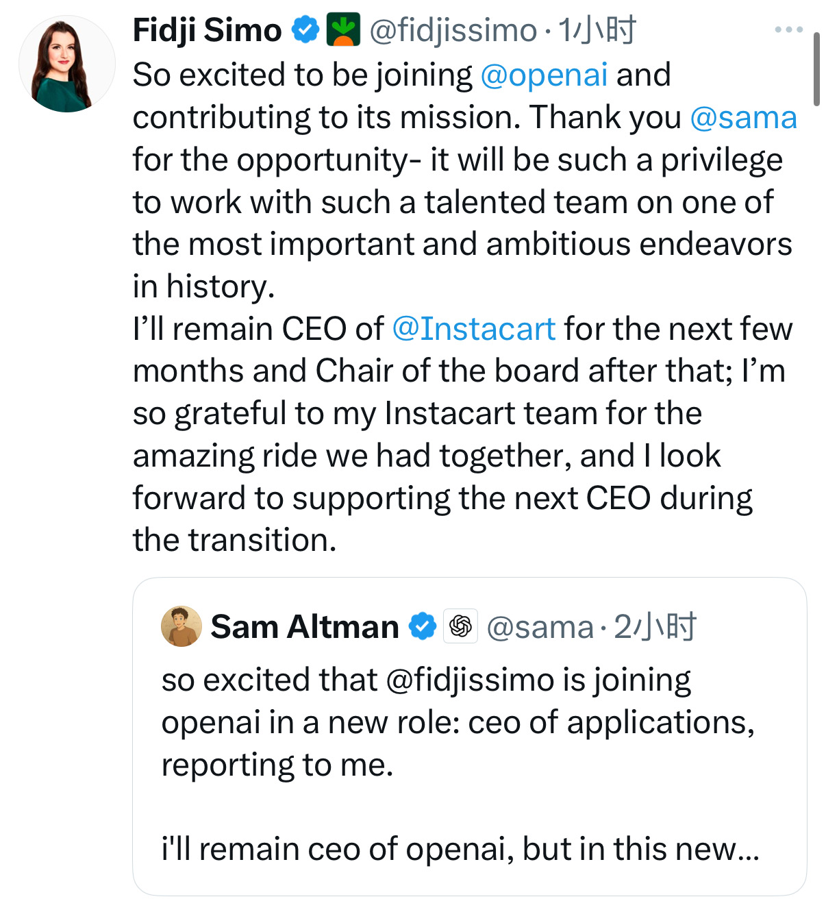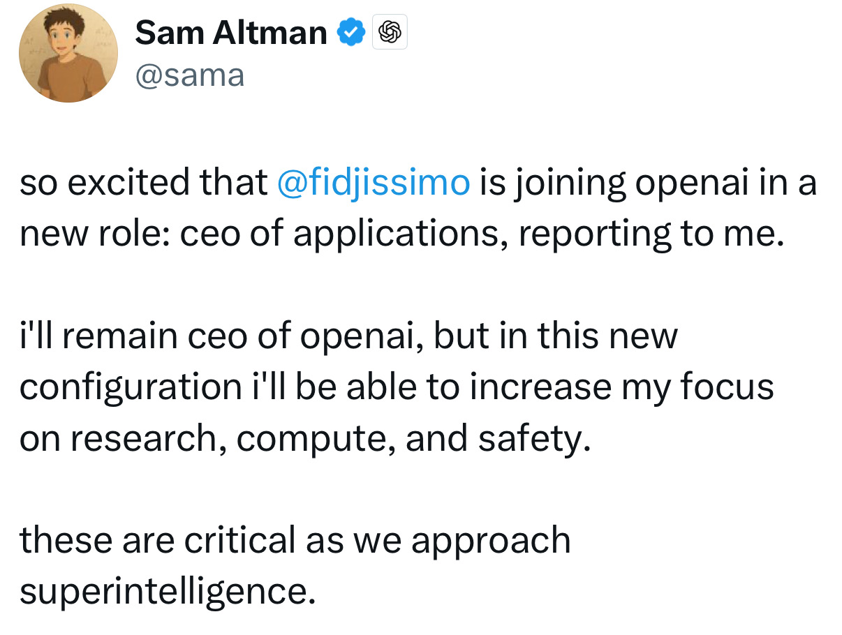Sam最新推文说要专注研究和超级智能了,邀请Instacart现任CEO Fidji Simo来担任应用方向的CEO