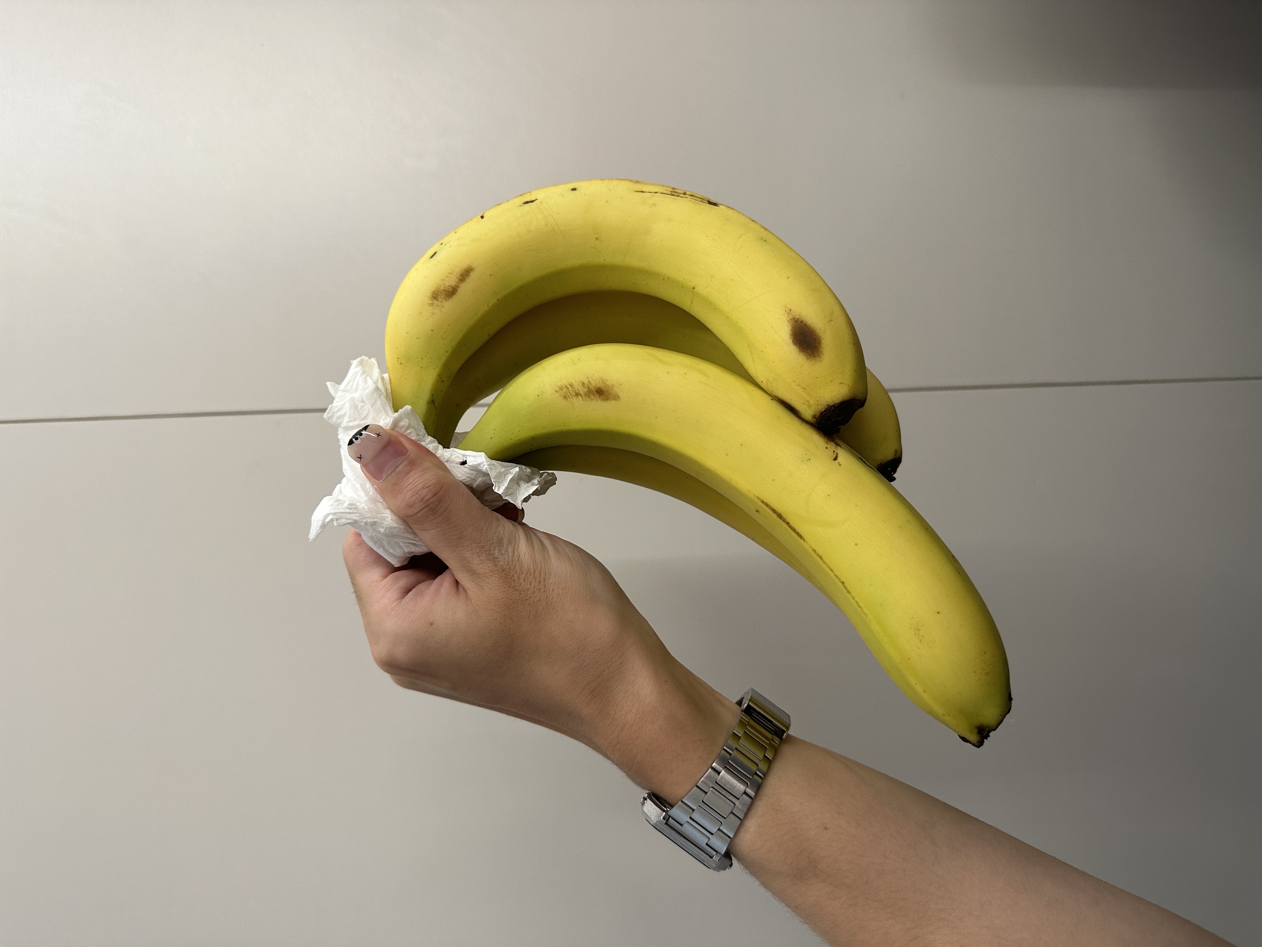 因为香蕉表面有催熟剂,所以刚买回来的(熟)香蕉需要先清洗一下,清洗后用纸巾擦干。打湿一张纸巾吧香蕉根部包住放在阴凉处,避免挤压。