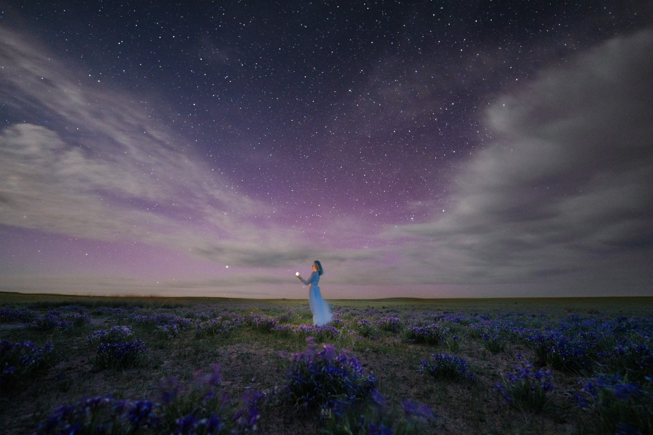 在(县道边牧民的)一片马兰花(鸢尾属)草原上,(5度寒冷大风的夜晚)被双向奔赴的繁星和不期而遇的(没爆发的)极光包围(并瑟瑟发抖反思为什么不带厚羽绒)。
