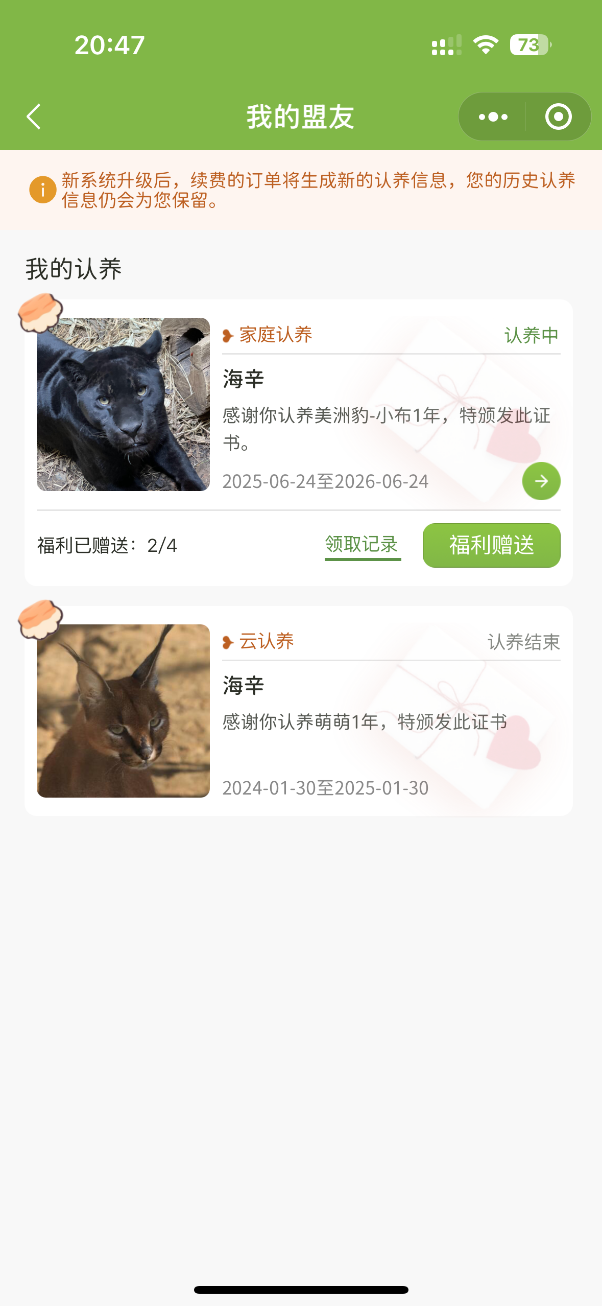 去年认养了一年狞猫萌萌,今年家庭认养了一年美洲豹小布!