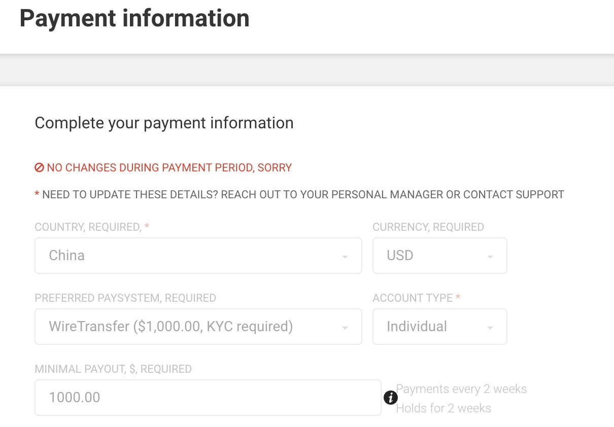 2.打开Payment information页面,填写支付信息。(如图) 主要包括:China、USD、WireTransfer(电汇)、Individual(个人),以及类似于Google Adsense的收款银行账户信息,注意需要使用英文。