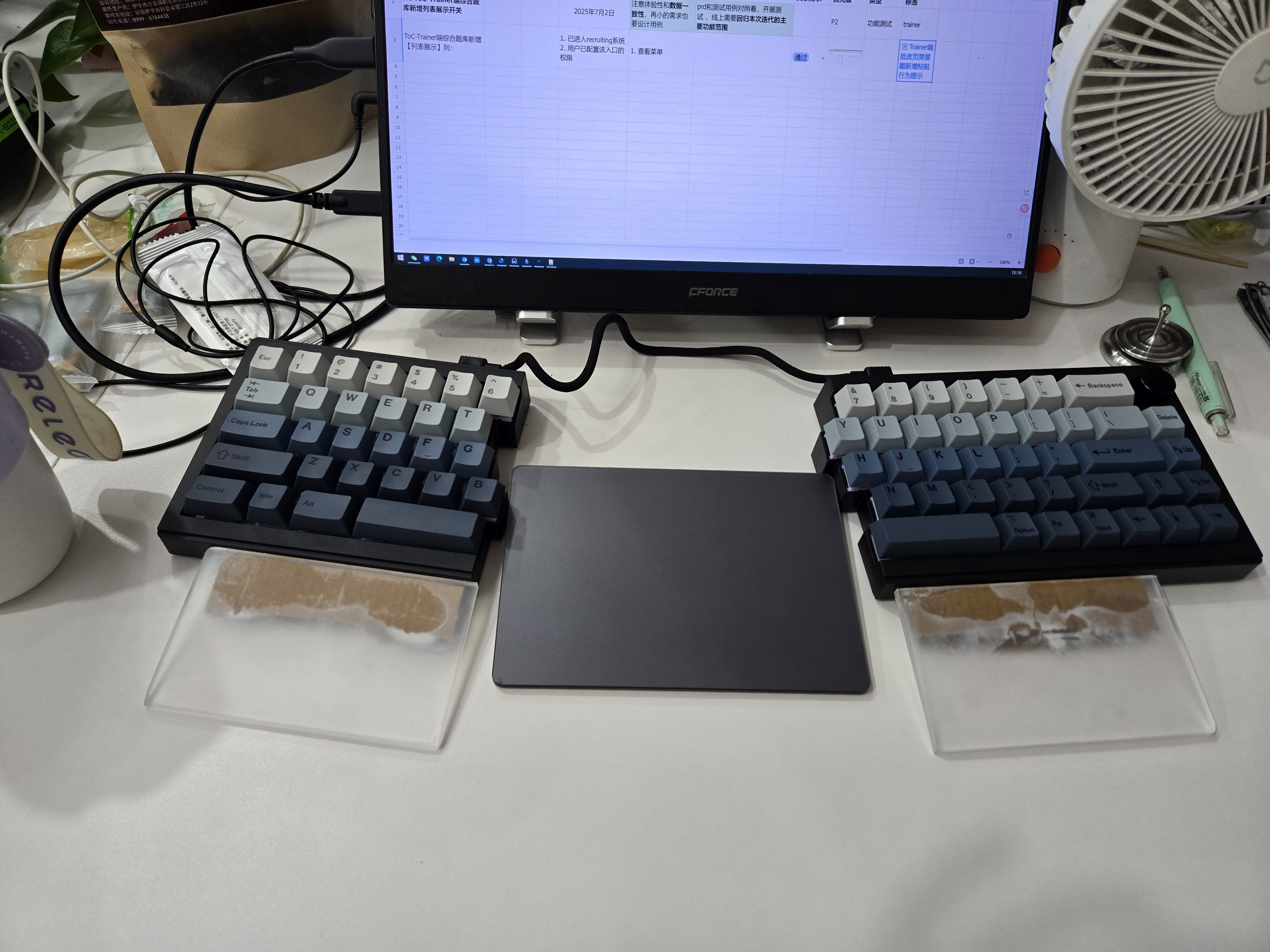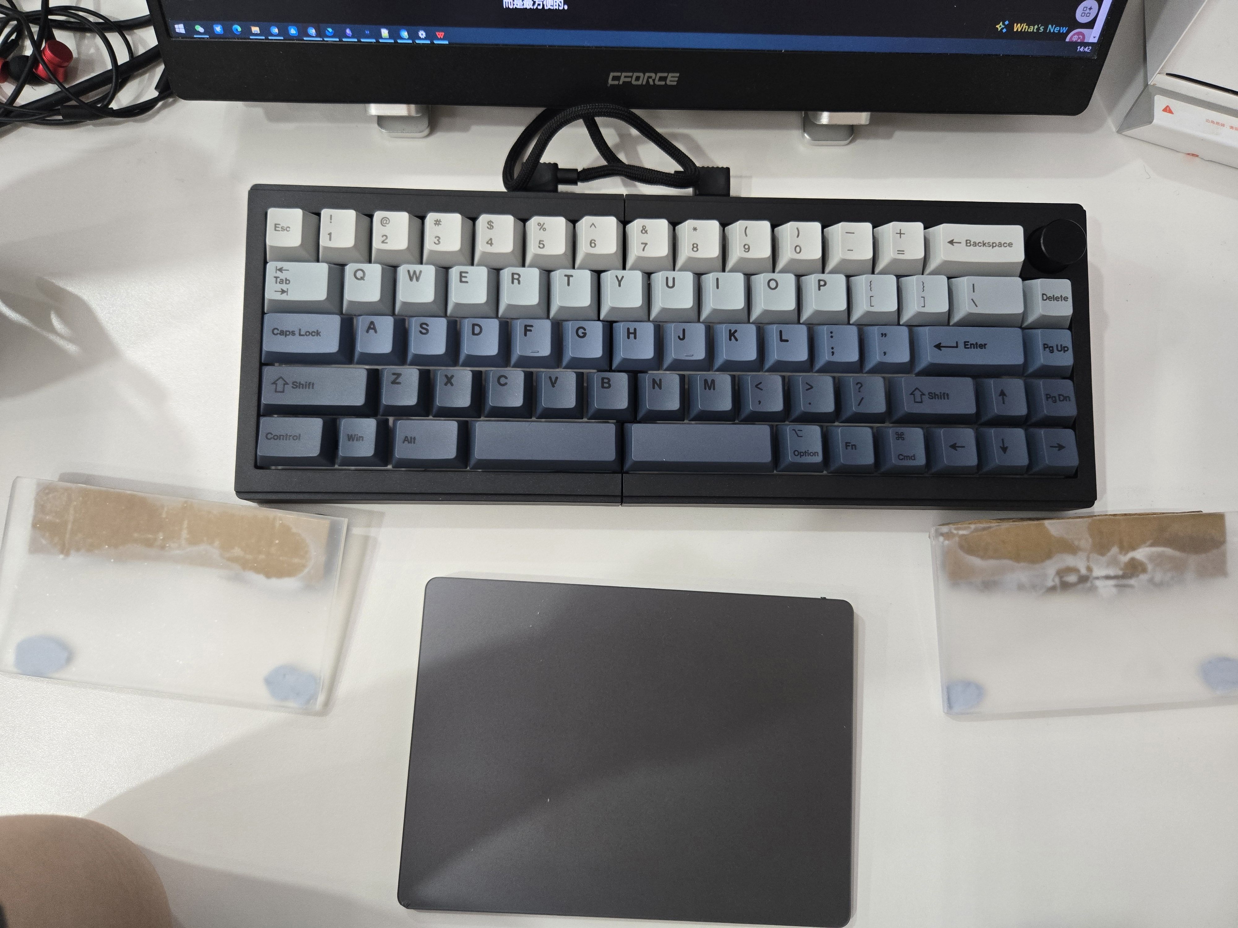 又换键盘了,还是换成基础款的分体键盘,可以分开,也能合并到一起,支持有线,蓝牙,2.4g连接,支持热插拔,键位也是原生的,不用适应直上直下的布局。