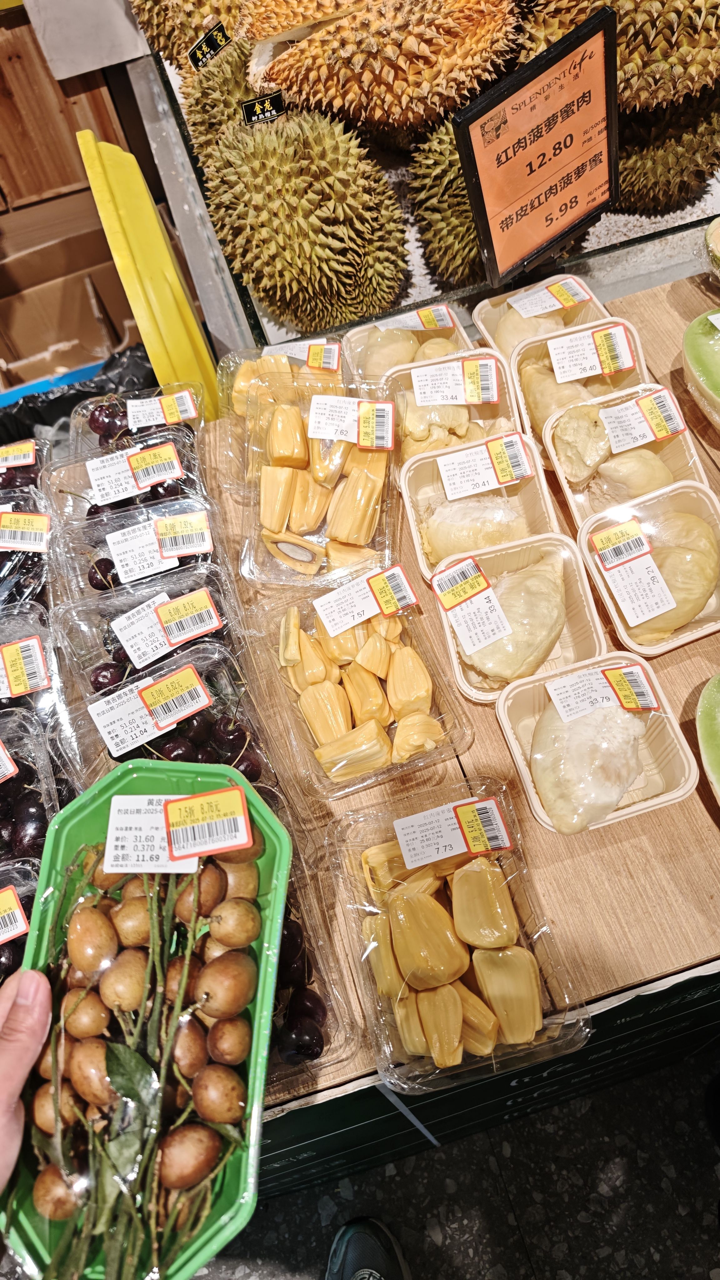 超市打折,车厘子,榴莲买一送一,我买了打折的黄皮果,因为没吃过