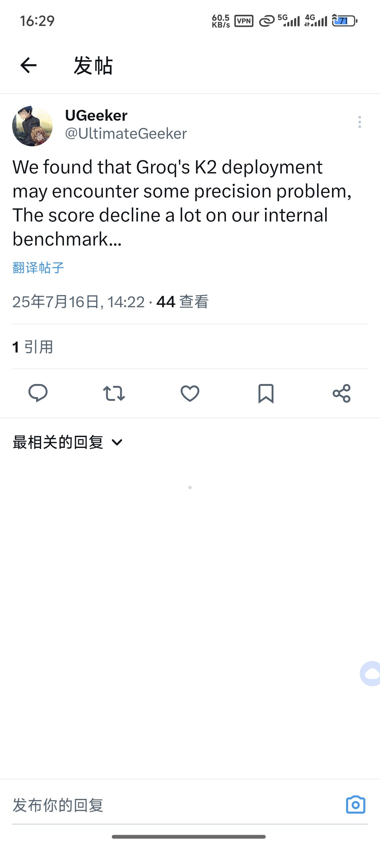 Groq 的 K2 疑似有精度问题,这可能导致 K2 在 Artificial Analysis 的评估中还被低估了。