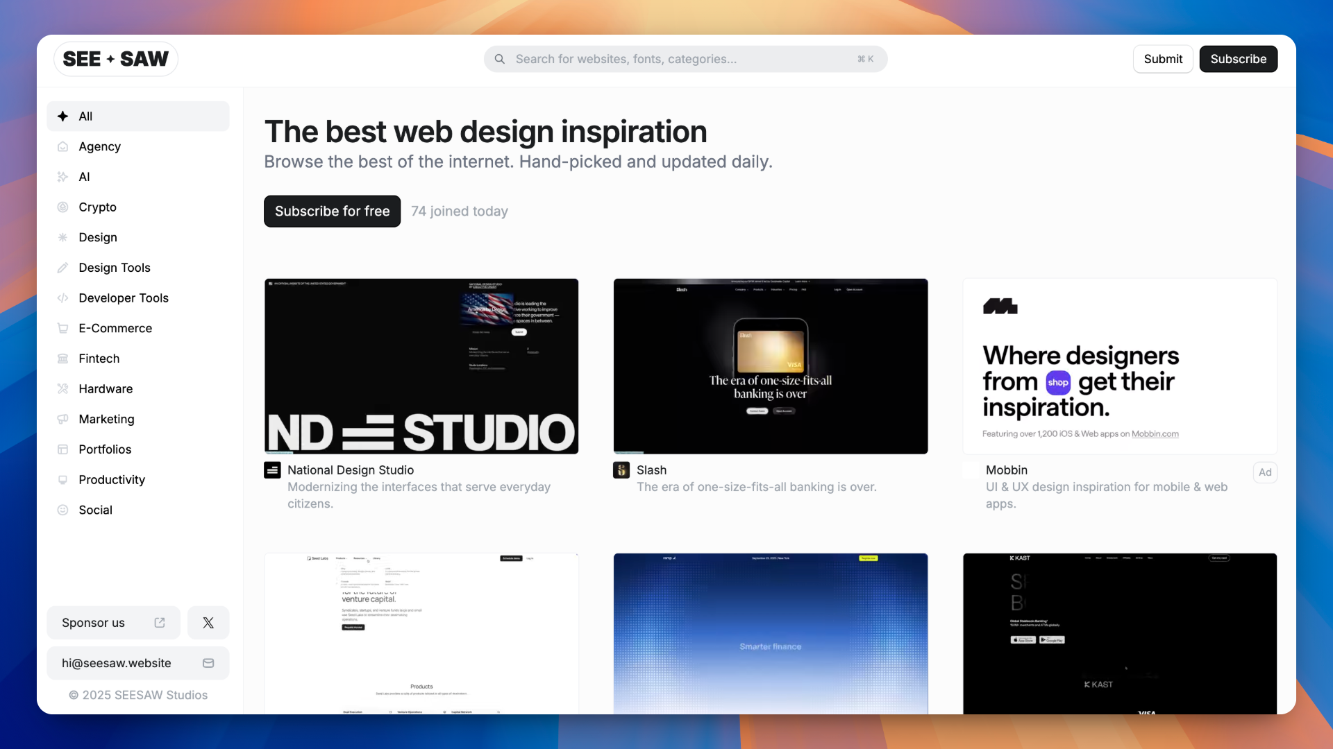 收录了AI、设计、开发者工具、电商、个人网站等各领域的优秀设计网站,人工每天收录更新,适合来这探索发现各种有意思的网站,找到设计灵感