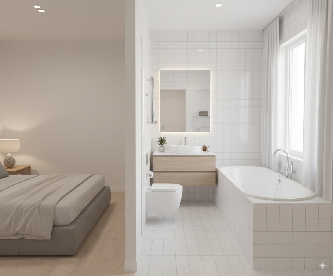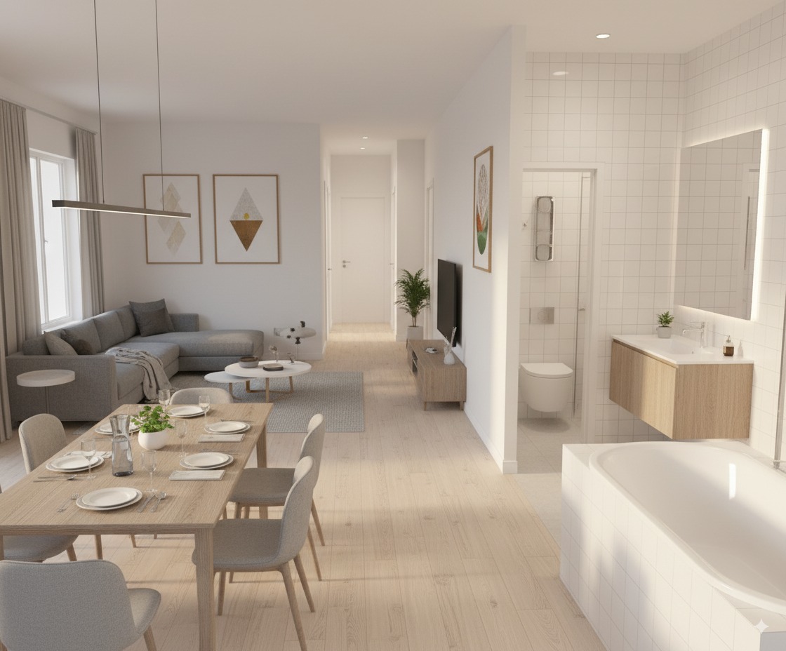 提示词 2:Help me generate a realistic photo looking from the dining table towards the bathroom, which must comply with the house layout in the design plan, and appropriate decorations can be added.