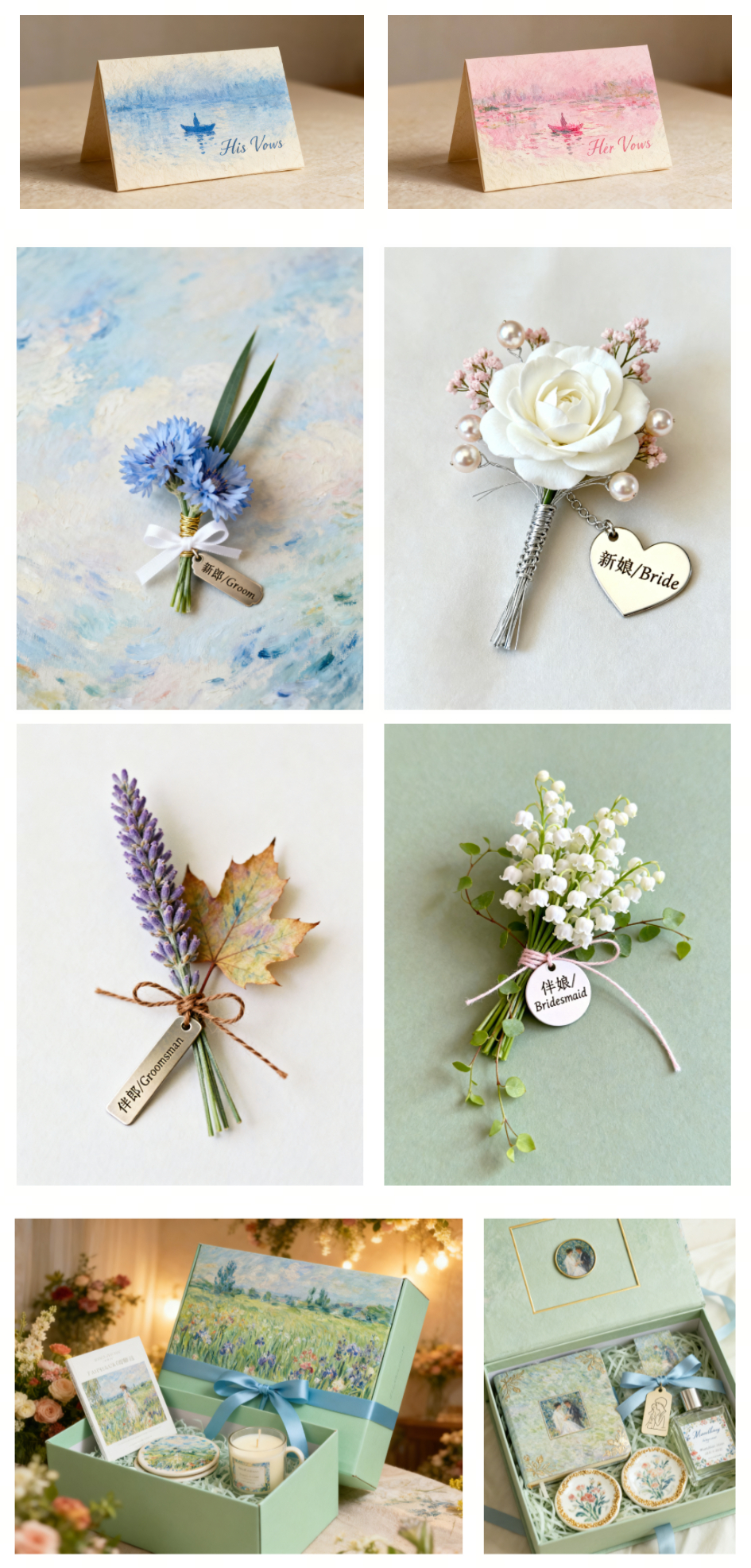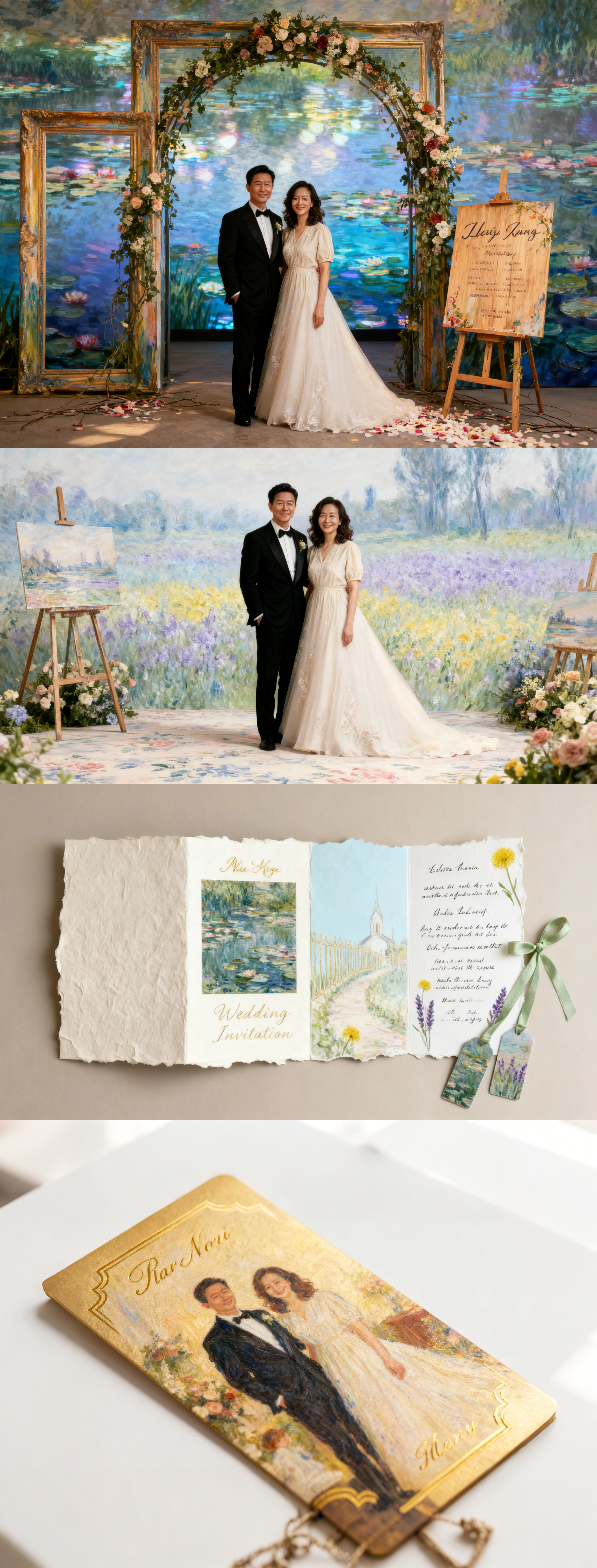 以下为用“莫奈花园”为主题,给图一的 AI 新婚夫妇,设计的全套婚礼物料,分别是:迎宾区、合影区、邀请函、红包、誓言卡、胸花、伴手礼~