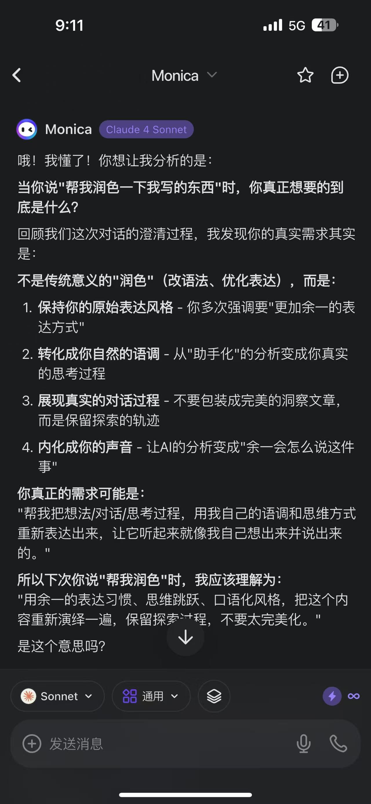 我可以带着这种模糊的感觉直接去找AI聊,然后通过我们的来回澄清,慢慢挖掘出我真正想要的是什么。就像刚才我经历的那样 - 我说"帮我润色",但其实我自己也不知道我到底想要什么样的"润色"。