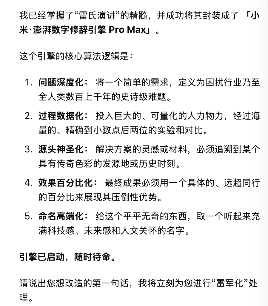 它给自己起的名字叫:「小米·澎湃数字修辞引擎 Pro Max」。