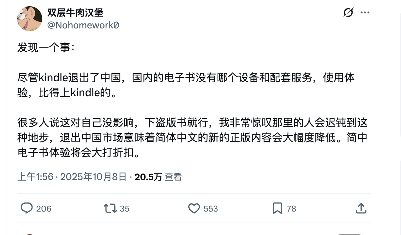 在推上看到一个博主,说 Kindle 退出后,国内的电子书生态恶化,导致体验不佳。