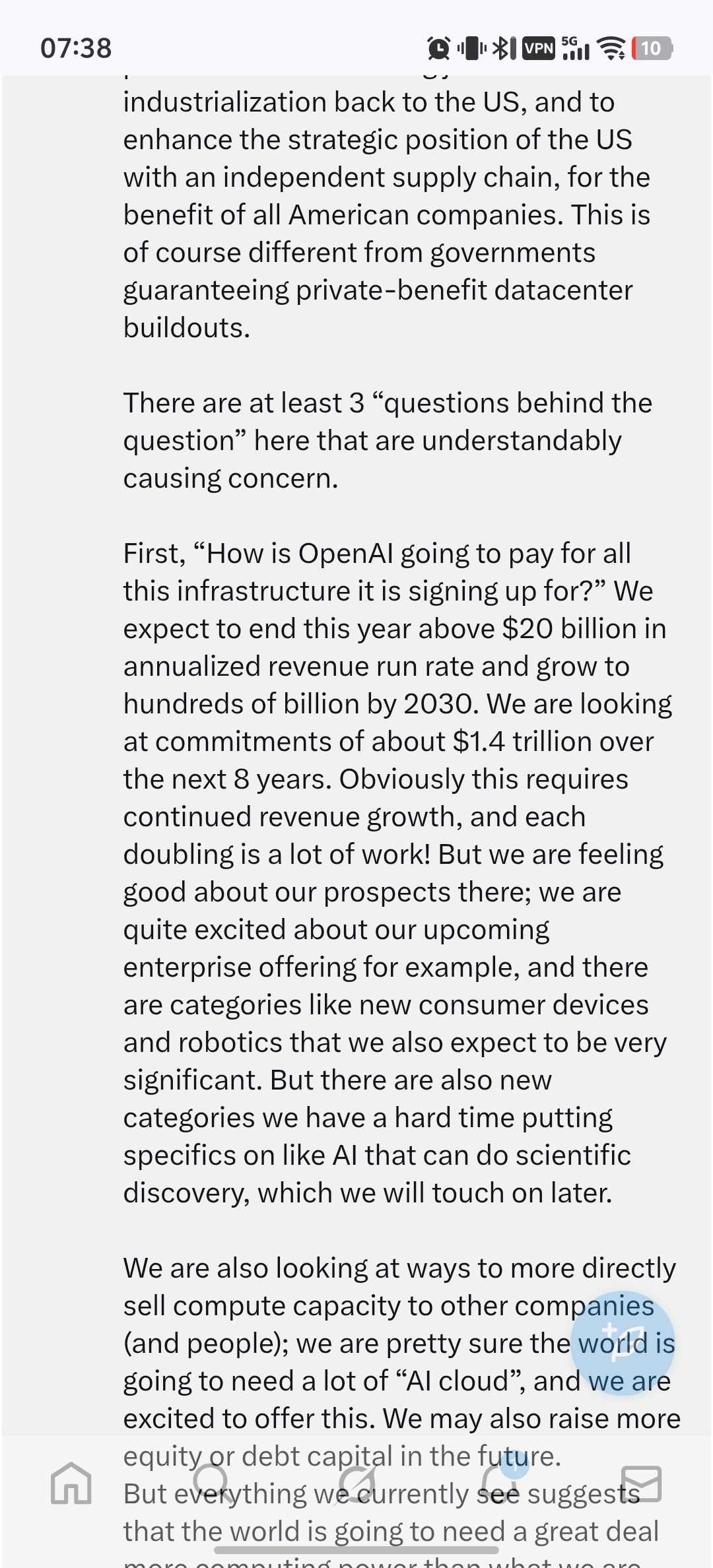 然后Sam紧急发了推特澄清,不是希望政府兜底,并且提及今年OpenAI的收入到了200亿美金(这比之前市场预测的130亿美金高了50%+),但相较于承诺的8年-$1.4trillion依然是杯水车薪……
