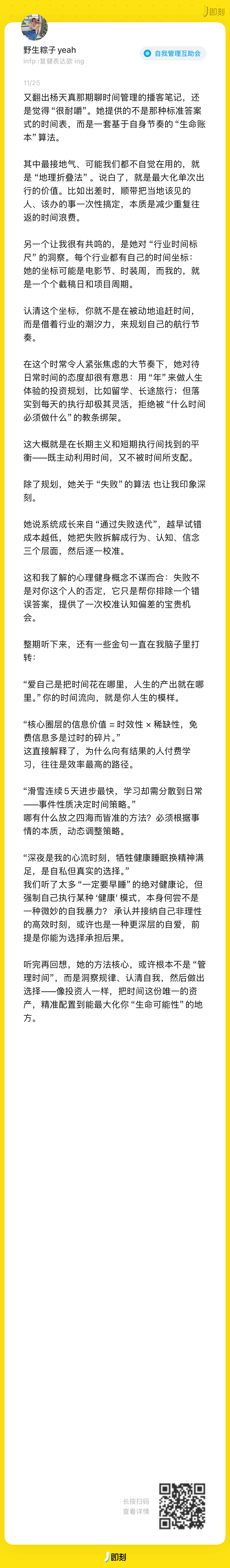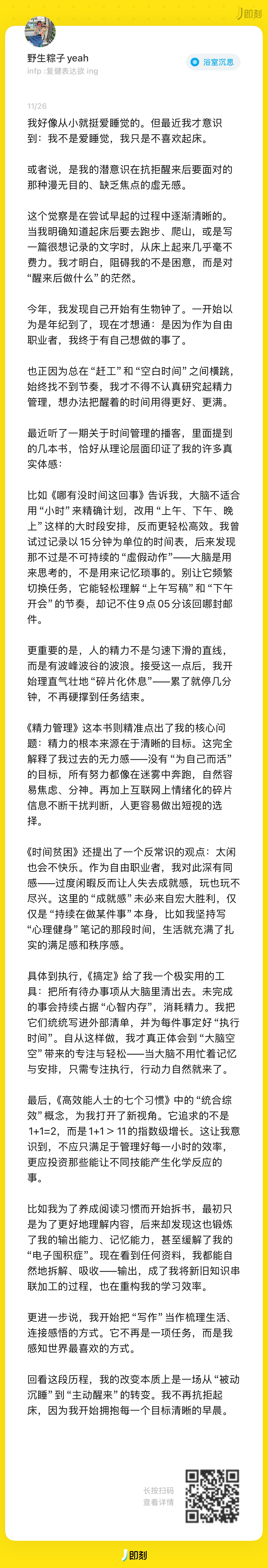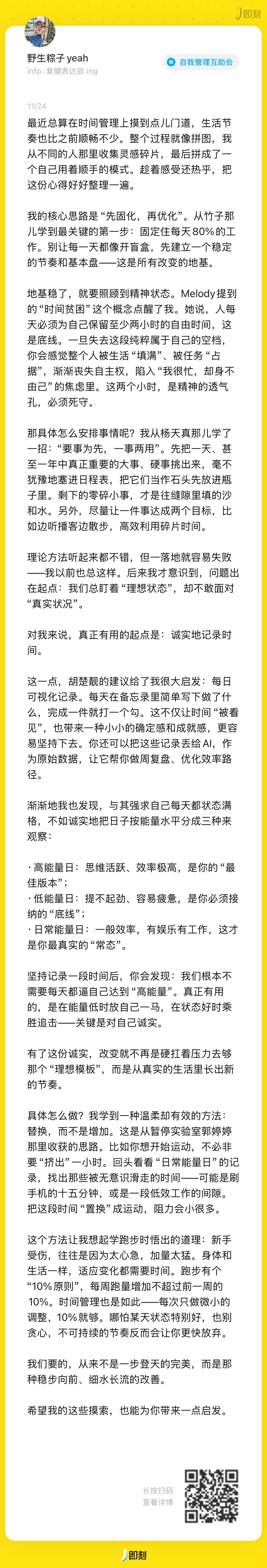从意识到“时间贫困”的焦虑,到学会管理“注意力”分配,最终进入“遵循精力节律”的节奏。