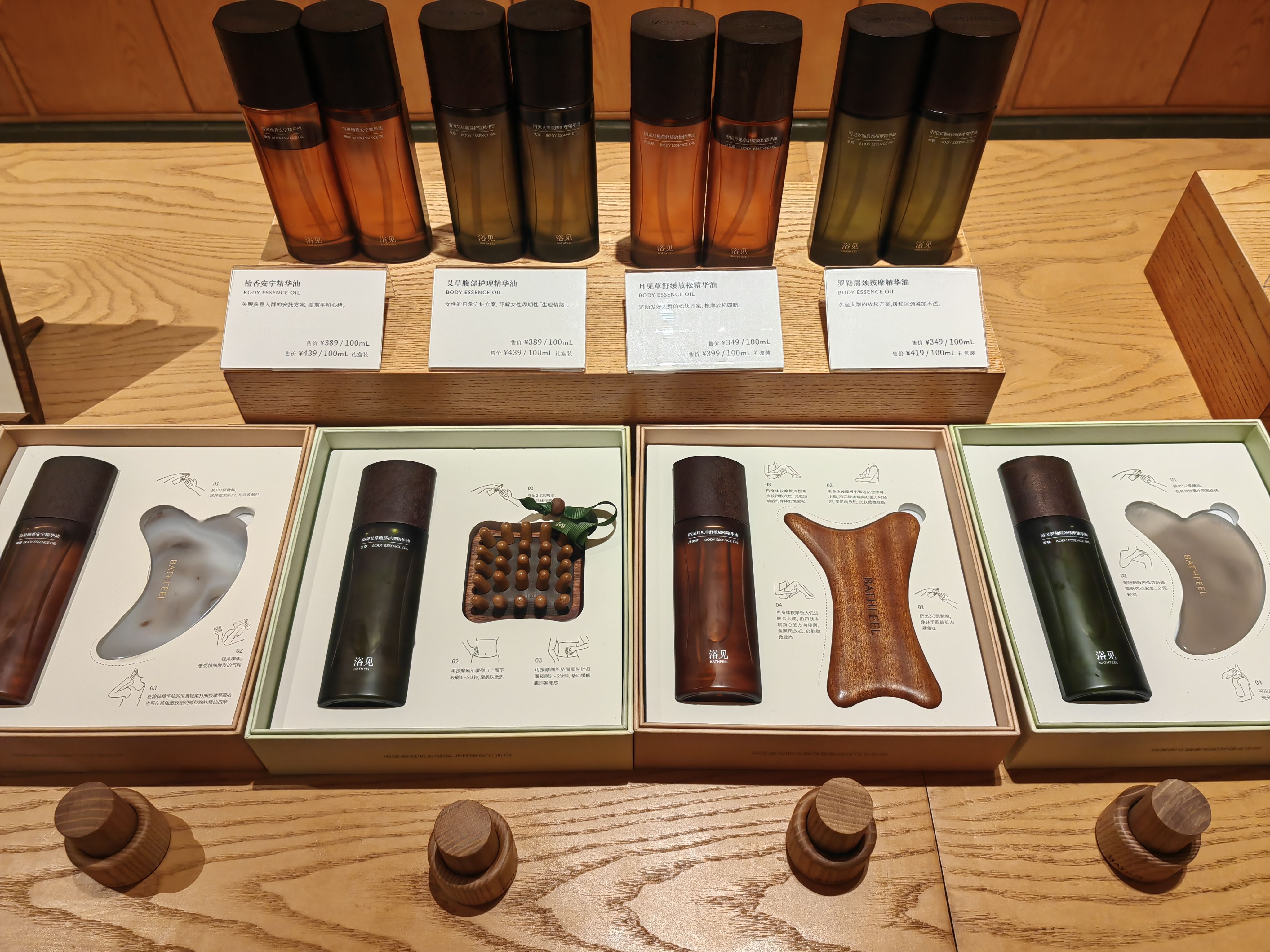 2. 产品本身是转化和停留的核心。浴见的产品品类已经从沐浴油、磨砂膏等身体护理产品延伸至发丝护理、面部护理,并搭配相应的护理工具,再叠加丰富的香味选择、不同的礼盒组合方式,SKU 多到让人应接不暇,看完这个看那个,新鲜感和探索欲源源不断。产品包装设计和质感让人忍不住拿起来看看试试,净手区方便直观体验清洁类产品的质地、洗感、香味,分分钟被种草转化。
