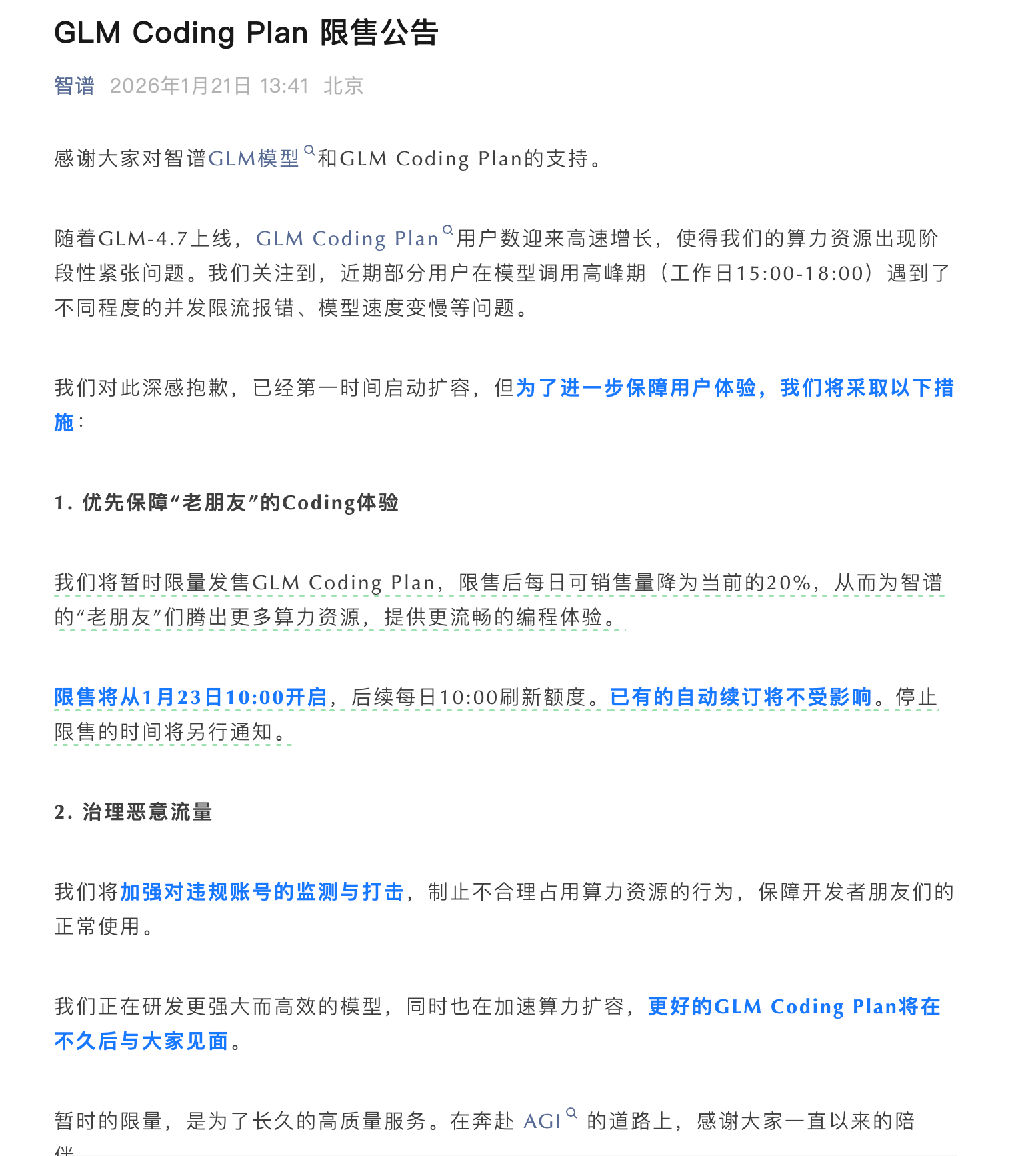 公告的核心就一件事:GLM Coding Plan 要开始限售了。