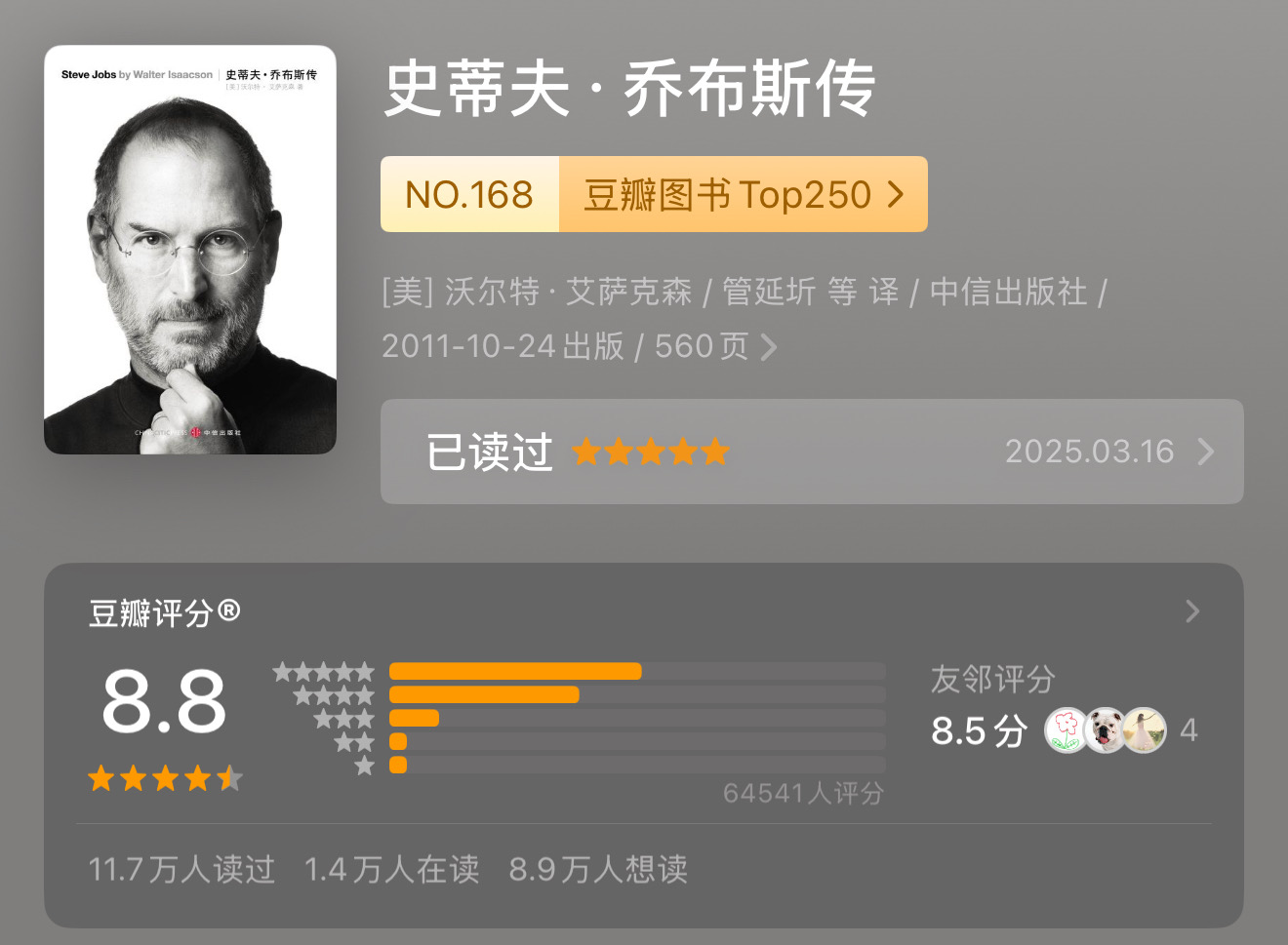 不过也越发认识到:读书只是获取信息的一种方式。看视频、上课、听播客等都是,并无高低贵贱之分。最近这两年播客这一媒介比较火,我想一定有人天生就偏爱“声音”这种信息载体。所以,我鼓励大家找到最符合自己特性的“信息接收方式”,并尽可能多地吸收那些结构清晰、有逻辑的优质信息,让自己持续向上生长。只是说到底,读书依然是我心中性价比极高的一种方式。它可以跨越漫长的岁月长河,把古人的智慧浓缩在有限的篇幅里。就拿伟人传记来说——即便斯人已逝,我们依然能通过文字,理解他们曾经如何思考、如何抉择、如何走过困境。