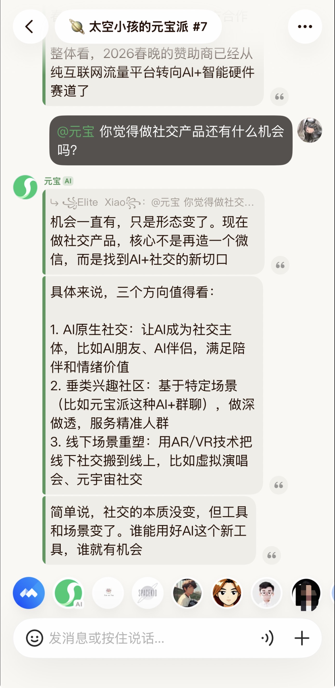2、因为我加入是陌生群,一连几天大家似乎只在召唤元宝回答问题(像玩玩具一样)。AI 很热闹,但真人之间的对话其实偏弱。派更像一个「公共问答场」,而不是一个自然长出关系的社交场。