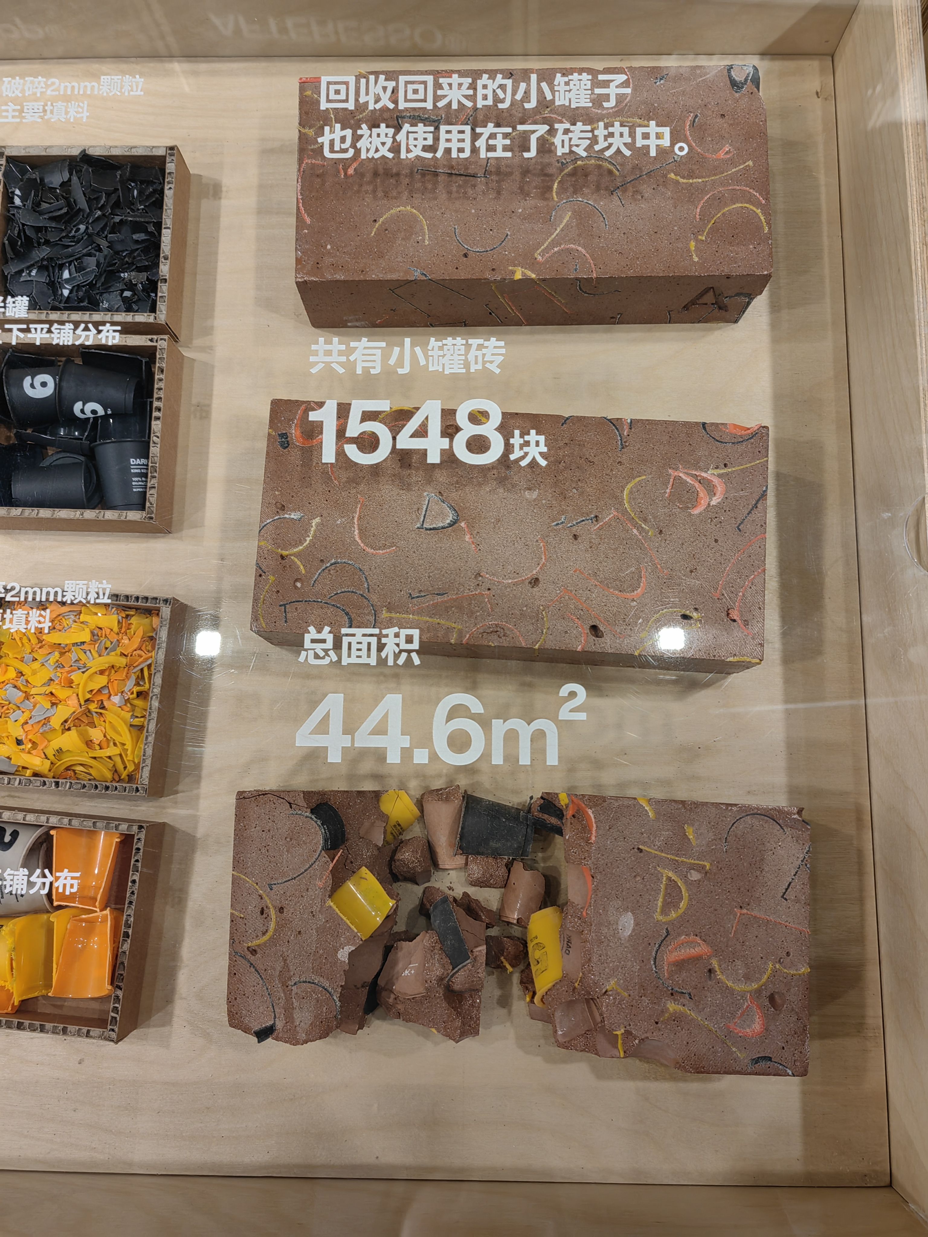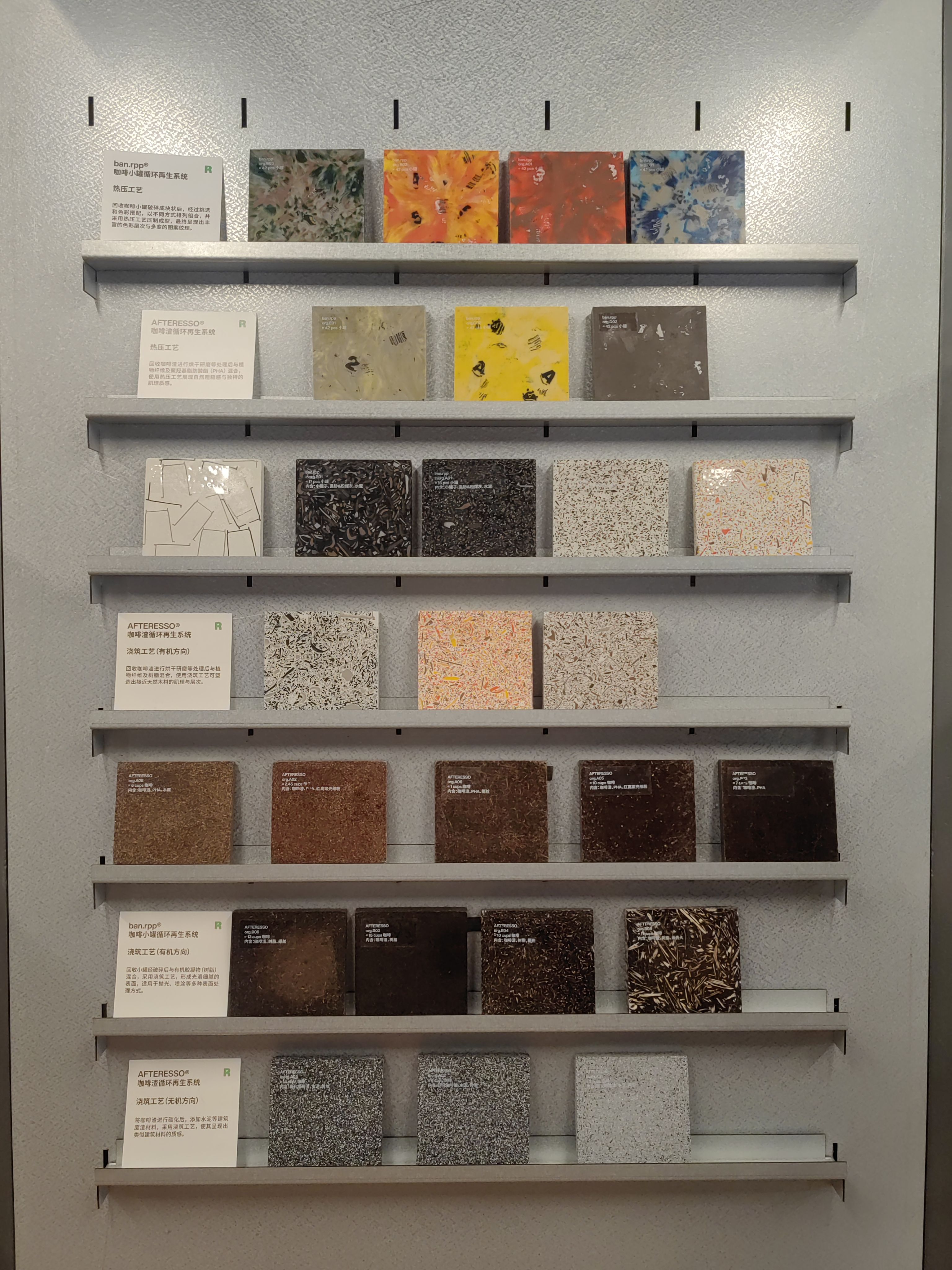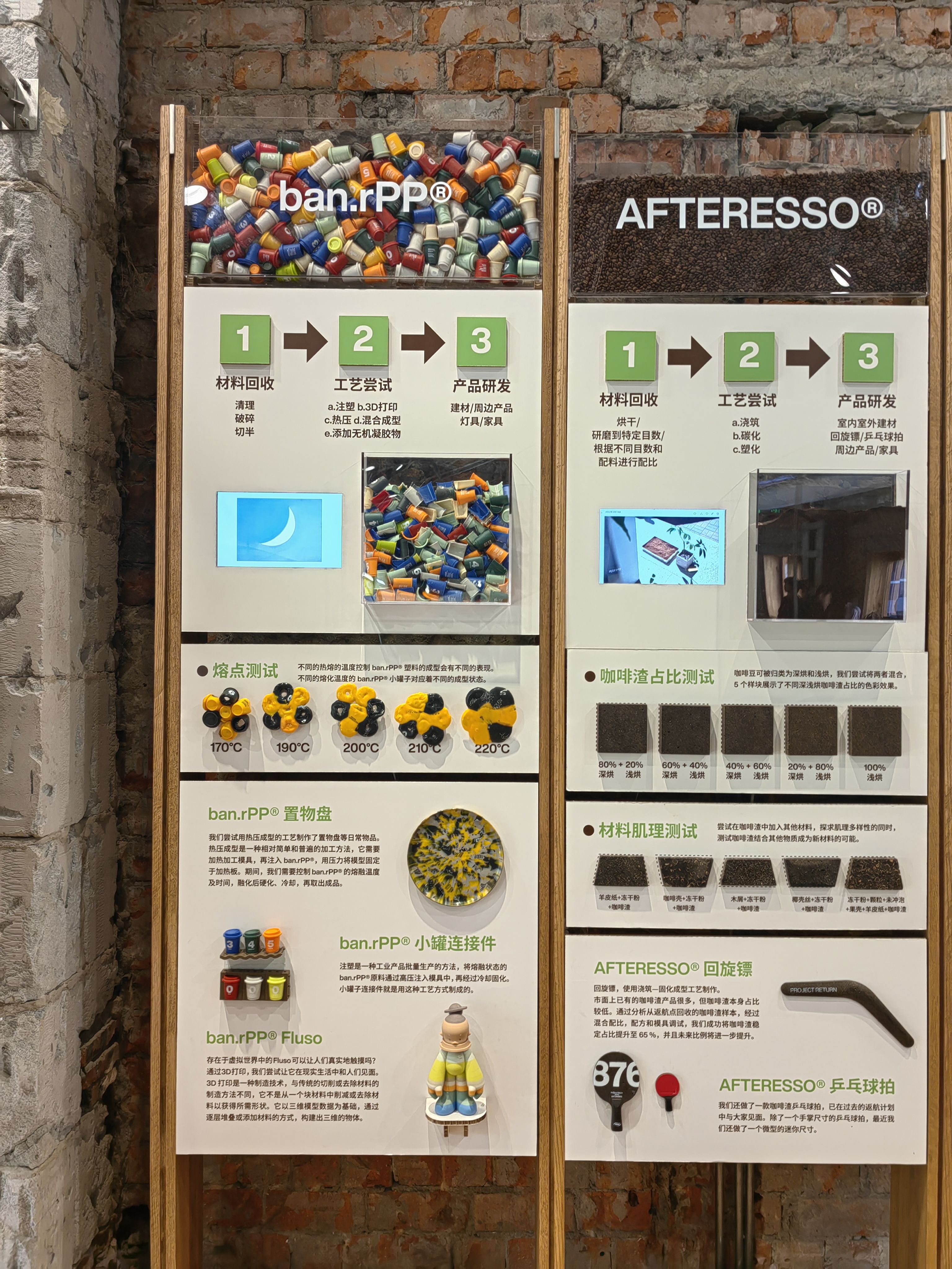 二楼是环保与休闲空间。三顿半将环保概念做到极致,既是一家咖啡公司,也是材料创新公司。熟悉的返航计划仍在继续,咖啡渣和老木船的再利用也让人眼前一亮。空间用了一半的墙面围绕着“来”和“回”对回收再利用流程进行科普拆解和材料展示,谁能想到砖块里也藏着返航的咖啡罐呢。