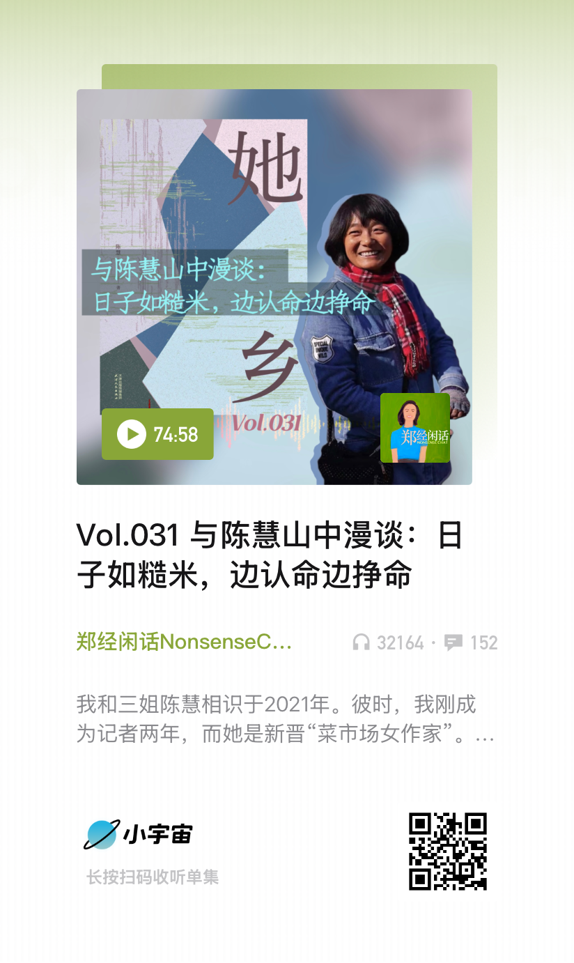 陈慧有着非常跳跃活泼的表达能力,也有着不寻常的智慧,如她的名字一般。也希望将来,可以有更多的人可以看到她的“摆摊”文学,她说自己还称不上作家的头衔,作家是会给这个社会带来一些贡献度的,比如莫言……