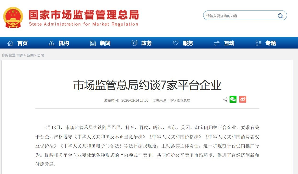 2月13日,市场监管总局约谈阿里巴巴、抖音、百度、腾讯、京东、美团、淘宝闪购等平台企业。