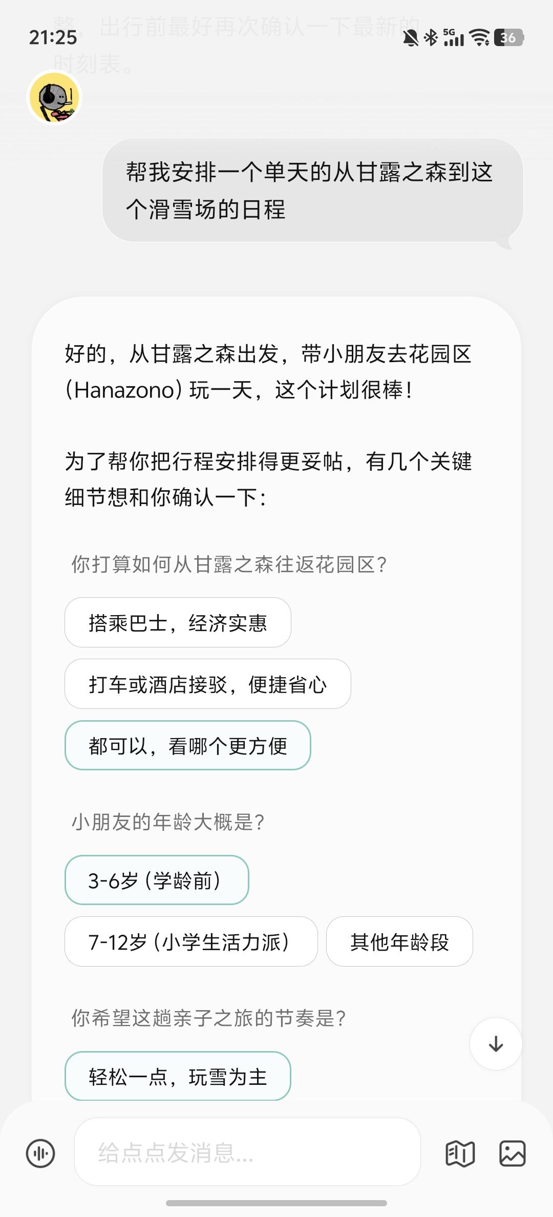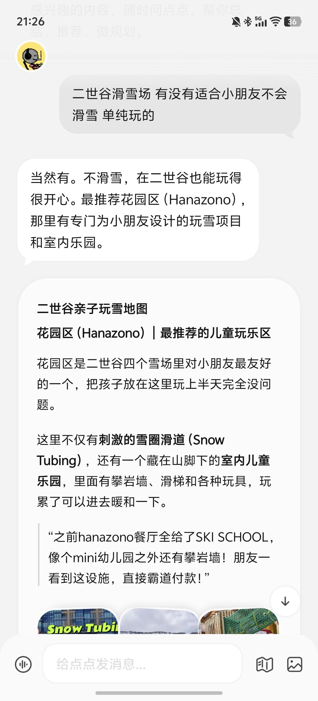 我把这个需求给了点点,先用基础模式问了下,推荐哪个雪场:(图1)