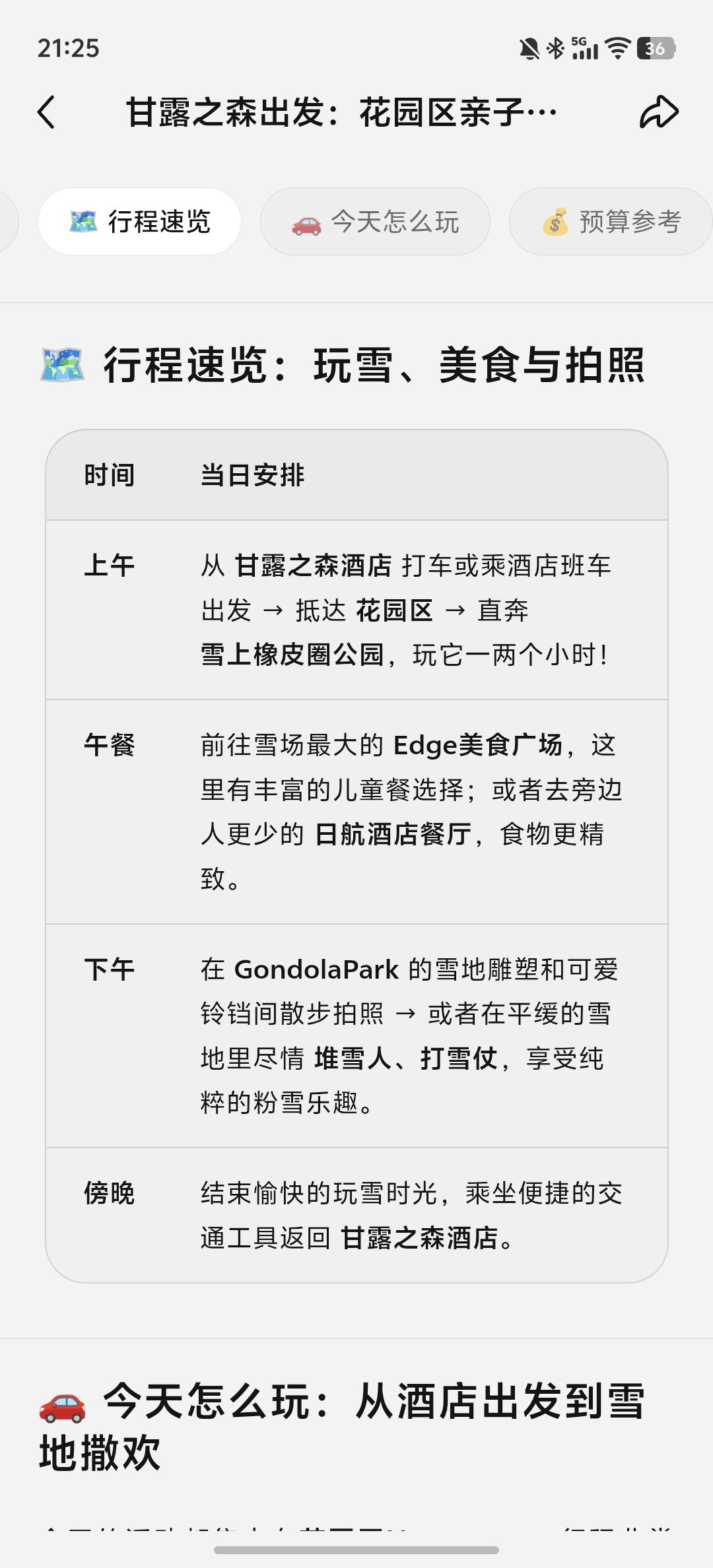 选择完之后,点点大概用了5分钟左右生成了一个带行程、预算、价格、tips的完整攻略:(图4、图5、图6)