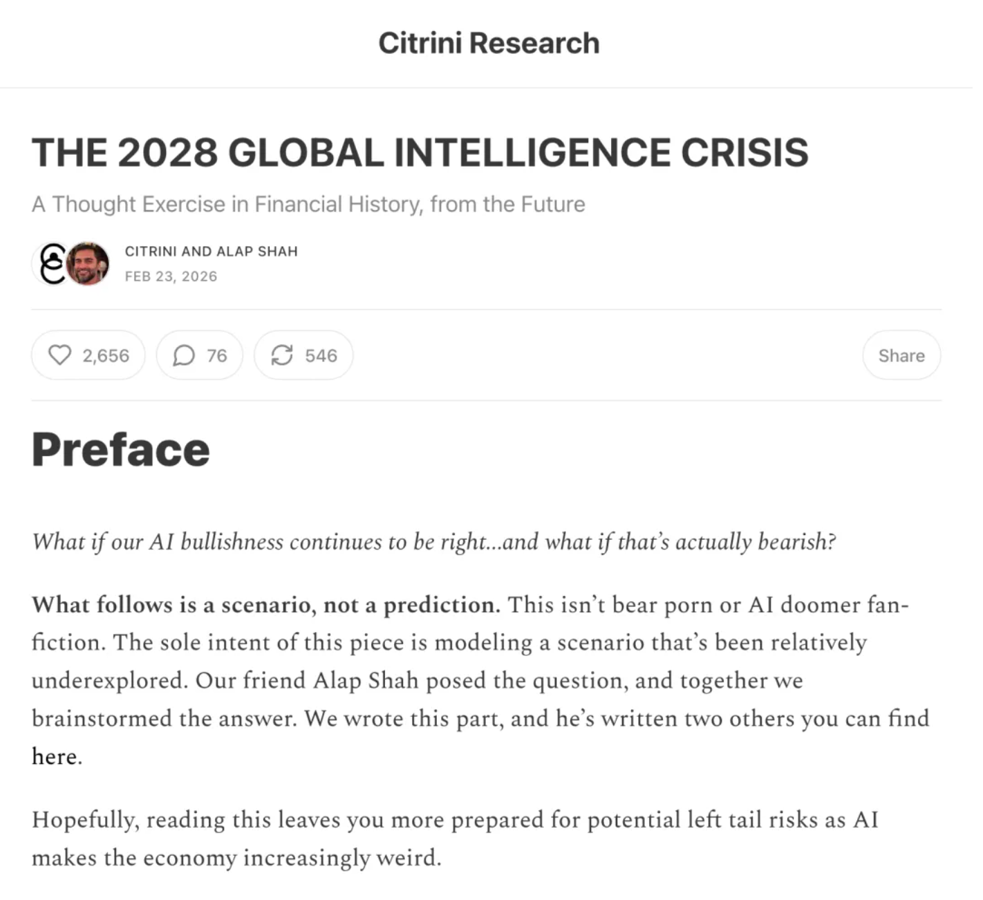 触发这场抛售的,是Substack上一篇名为《2028全球智能危机》文章。
