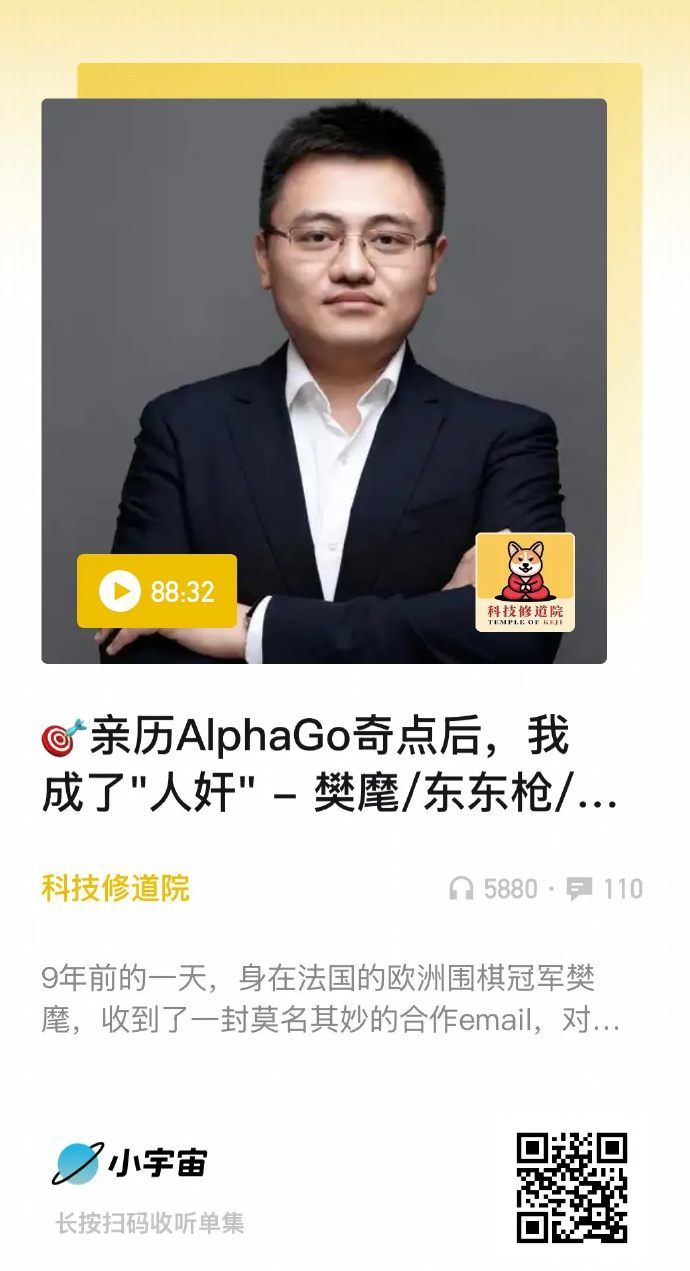 去年,时隔九年之后的纪录片中的樊麾上了一次刘鹏和东东枪两位老师的播客“科技修道院”。链接——