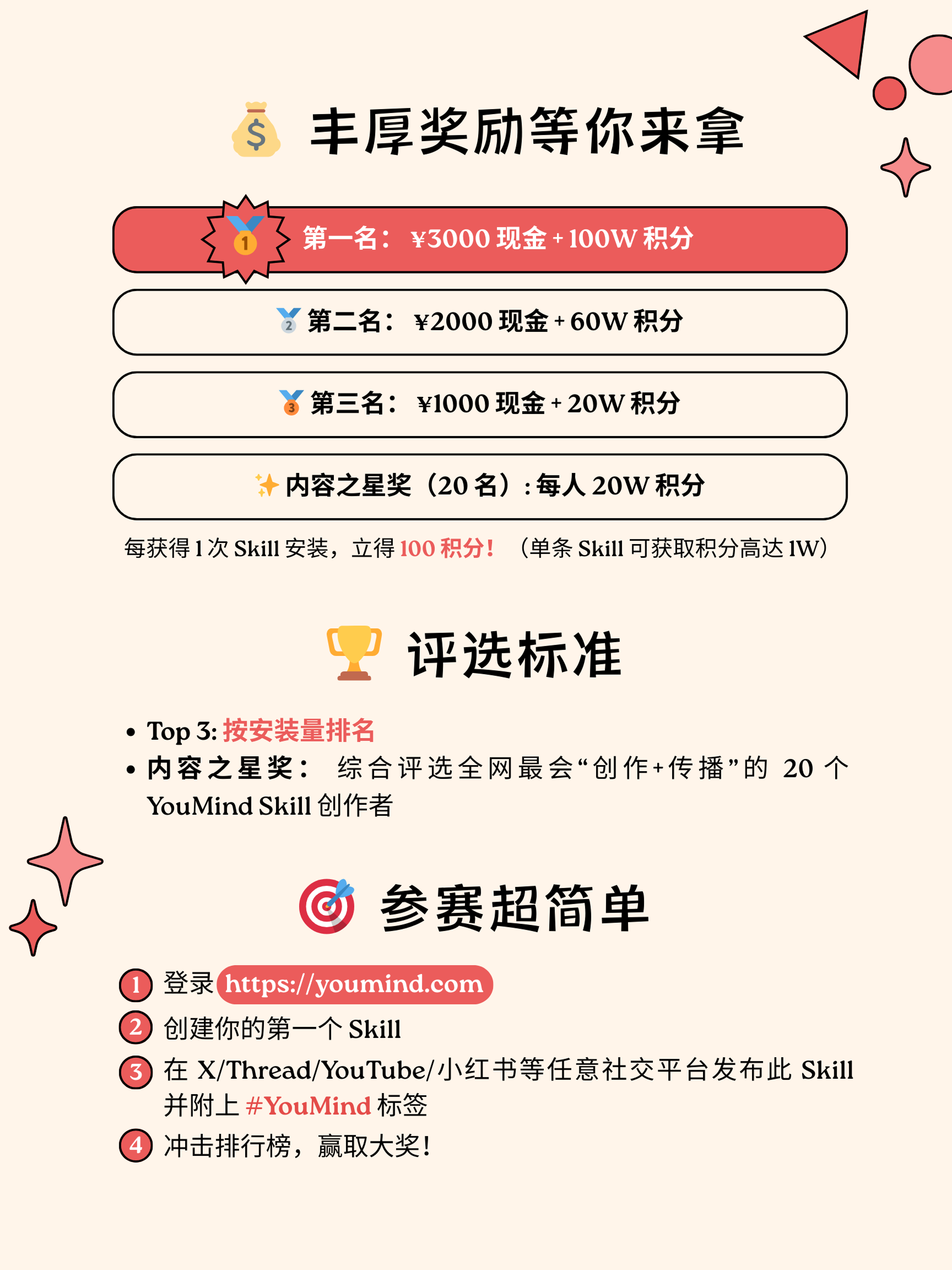🥇 第一名: ¥3000 现金 + 100W 积分