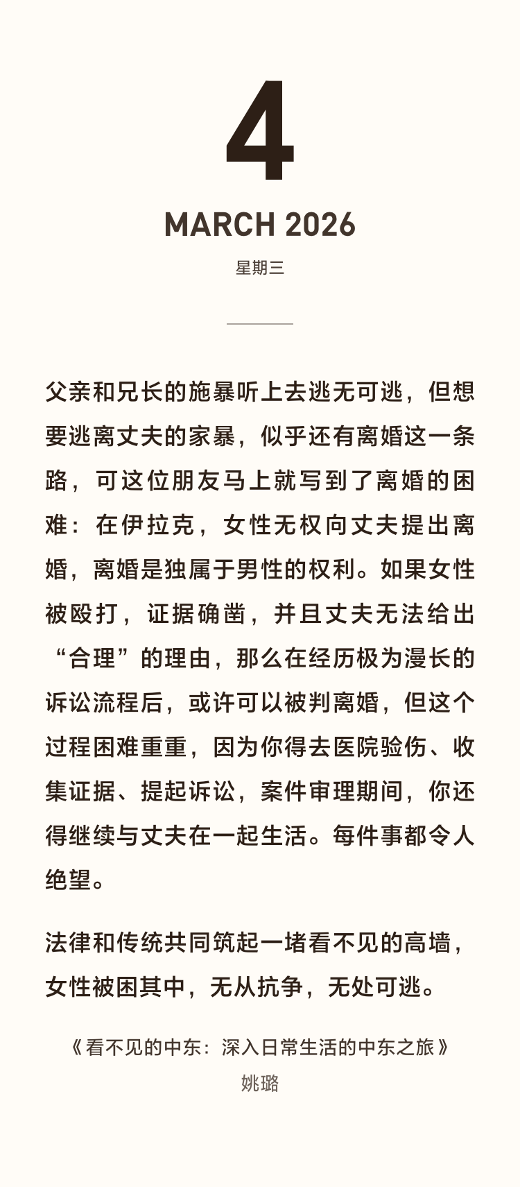 姚璐只是平静地记录所见所闻,却有着直抵人心的力量,中东从来不是单一的模样,这里有保守也有开放,有苦难也有温暖,有传统的坚守也有年轻的反抗。生活在这里的人们,和我们一样渴望幸福、珍视亲情、追求自由,他们不是战争的符号,而是活生生的、有血有肉的普通人。