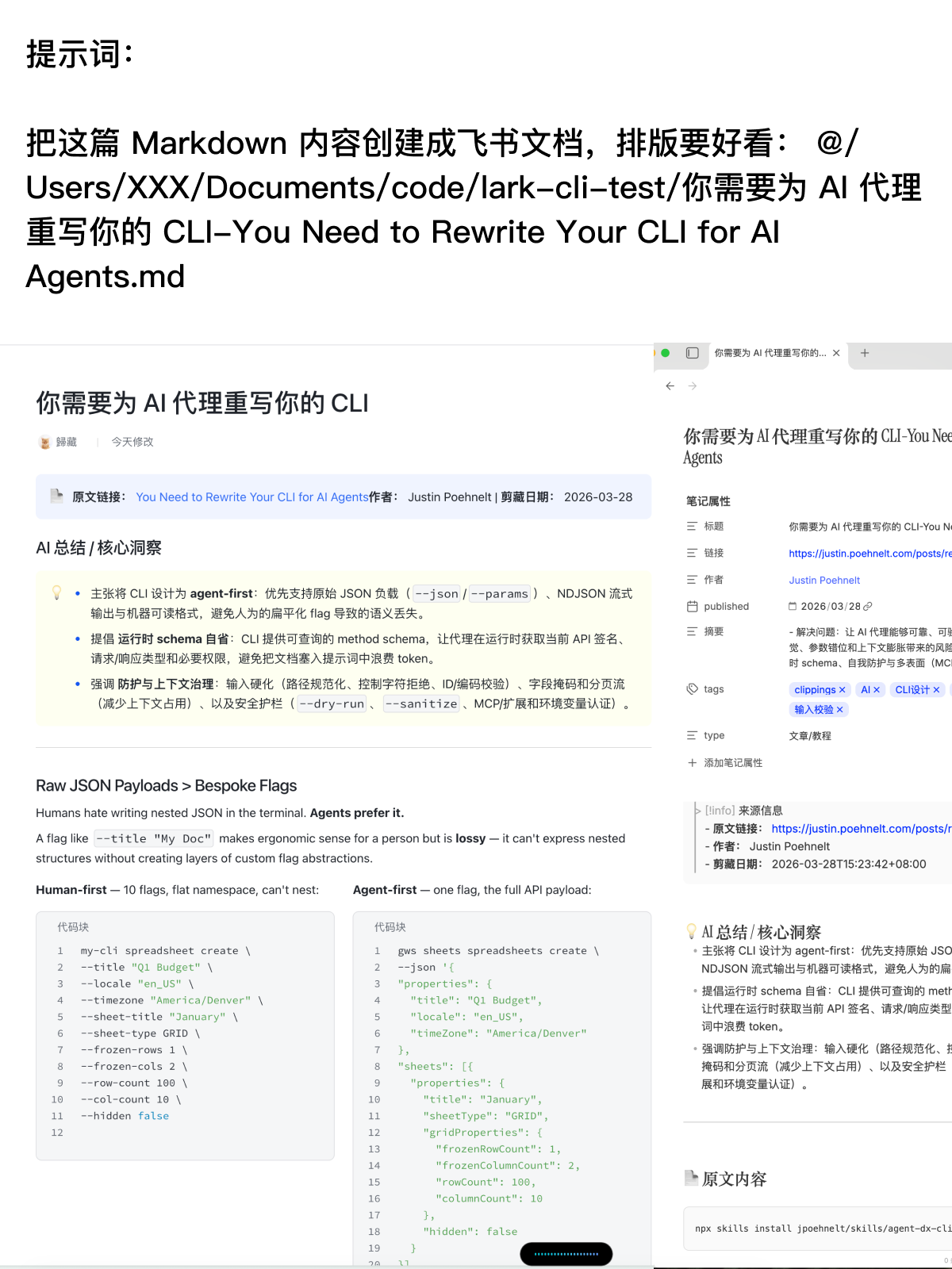 最主要的是,它还可以帮你把这个 Markdown 文件变成飞书的文档格式,帮你美化这个文档,效果非常牛逼。