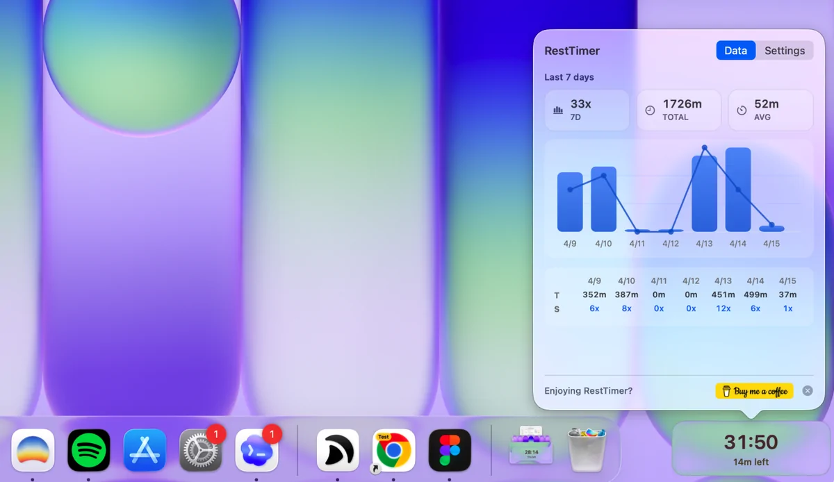 做了个免费的macOS的小工具。一个待在桌面角落的小计时器,显示这次解锁屏幕后工作多久了,时间一长就温柔提醒你该起来休息一下,防止一坐就是好几个小时。