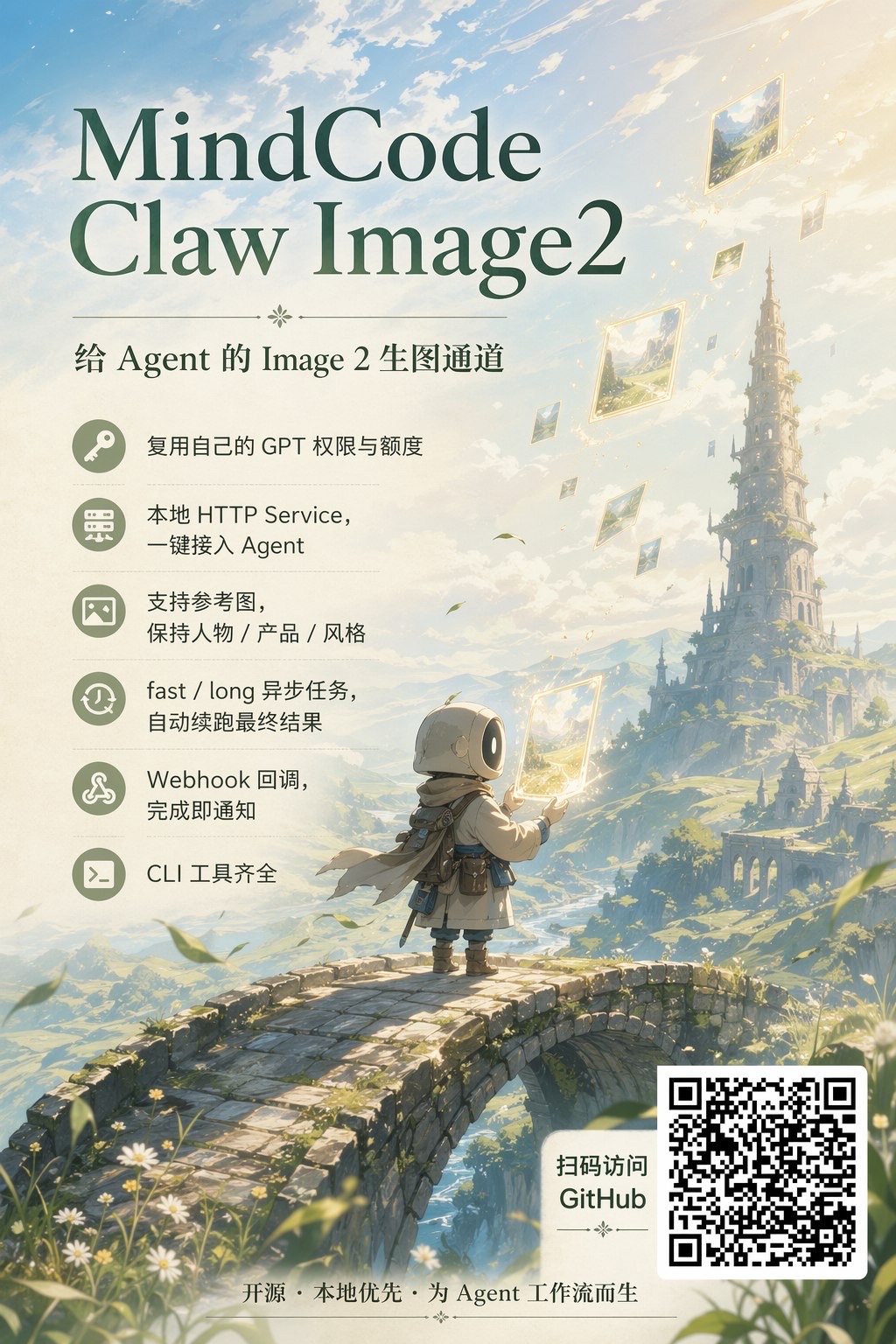 给我的开源项目做了两个海报,这个项目简单说,就是把你的ChatGPT订阅里的image 2 额度拿出来,封装成api,你的其他应用比如小龙虾,就可以接这个api,然后用image2 出图。实现做图自由,不需要额外花钱。