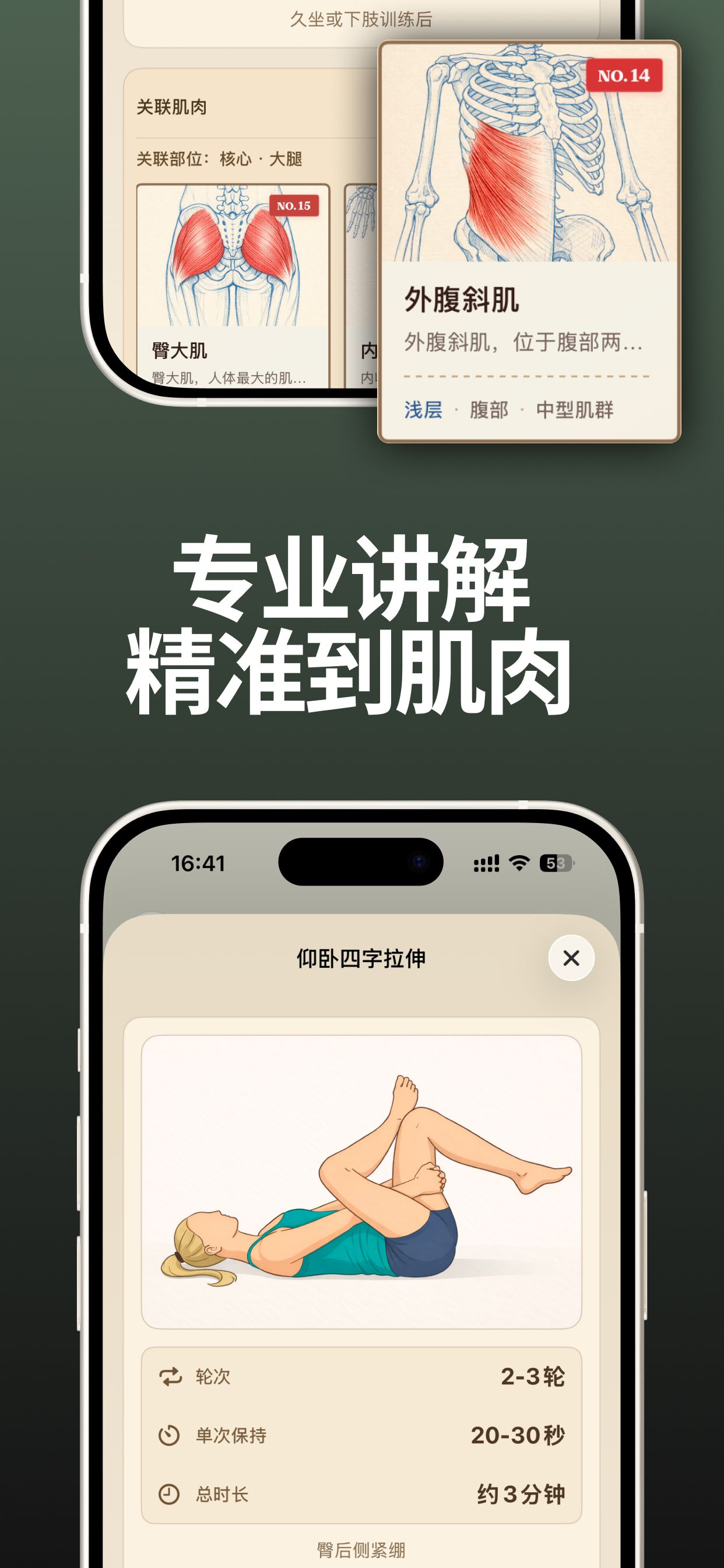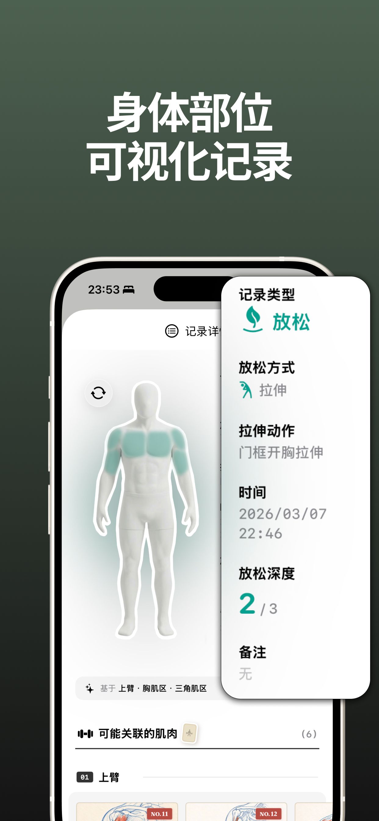 有拉伸跟练、疼痛紧张记录、肌肉卡片科普、AI总结能力