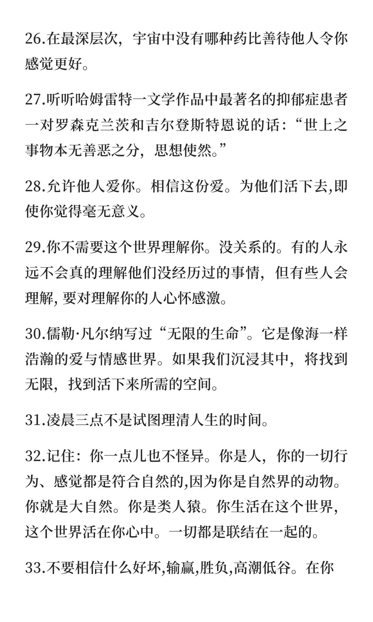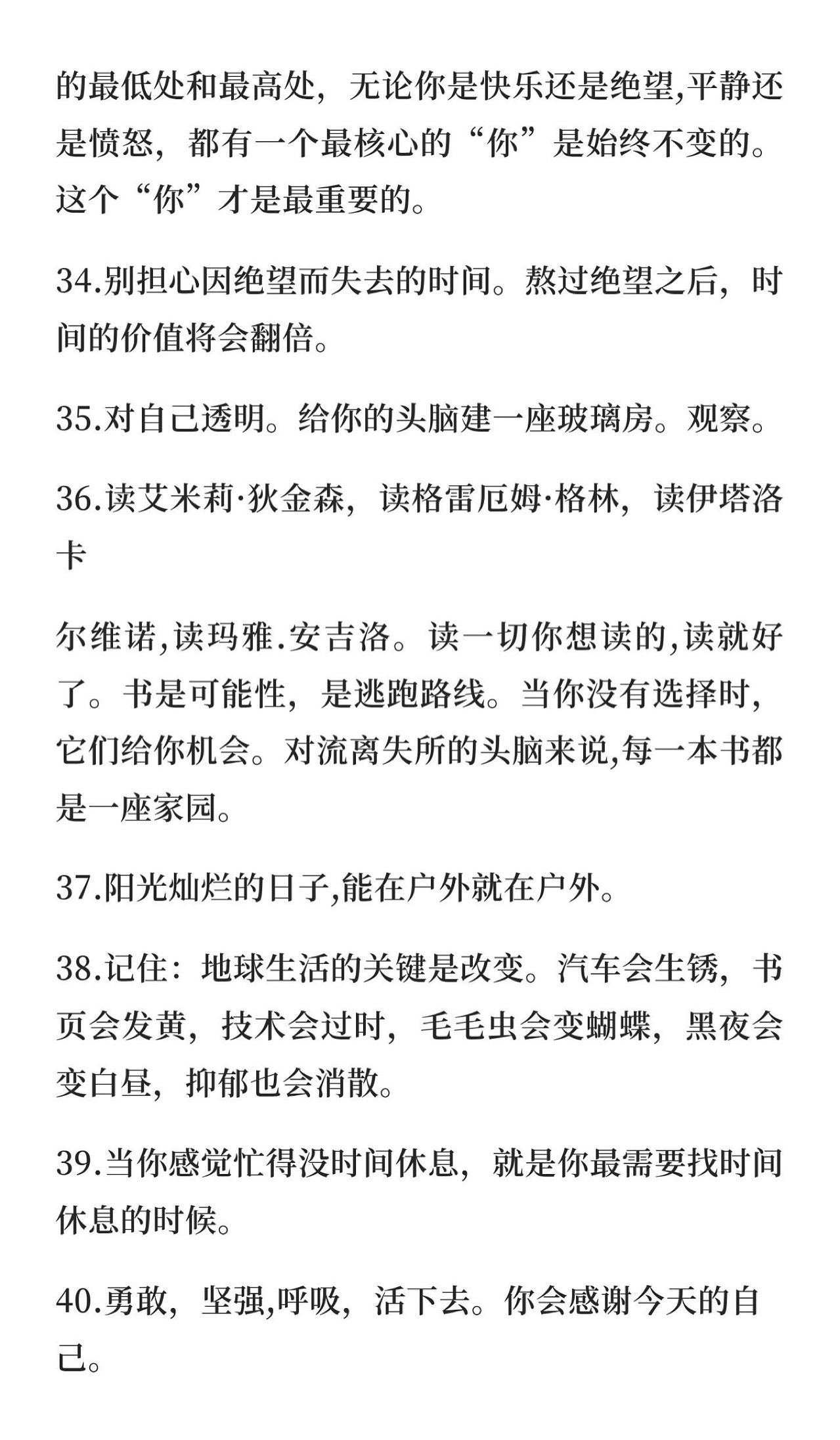 “记住:地球生活的关键是改变。汽车会生锈,书页会发黄,技术会过时,毛毛虫会变蝴蝶,黑夜会变白昼,抑郁也会消散。”