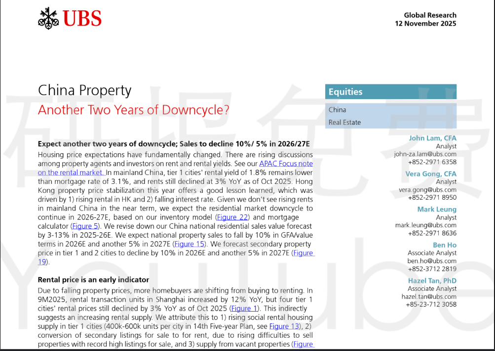 分享瑞银 2025 年 11 月 12 日关于中国房地产最新一期的研报