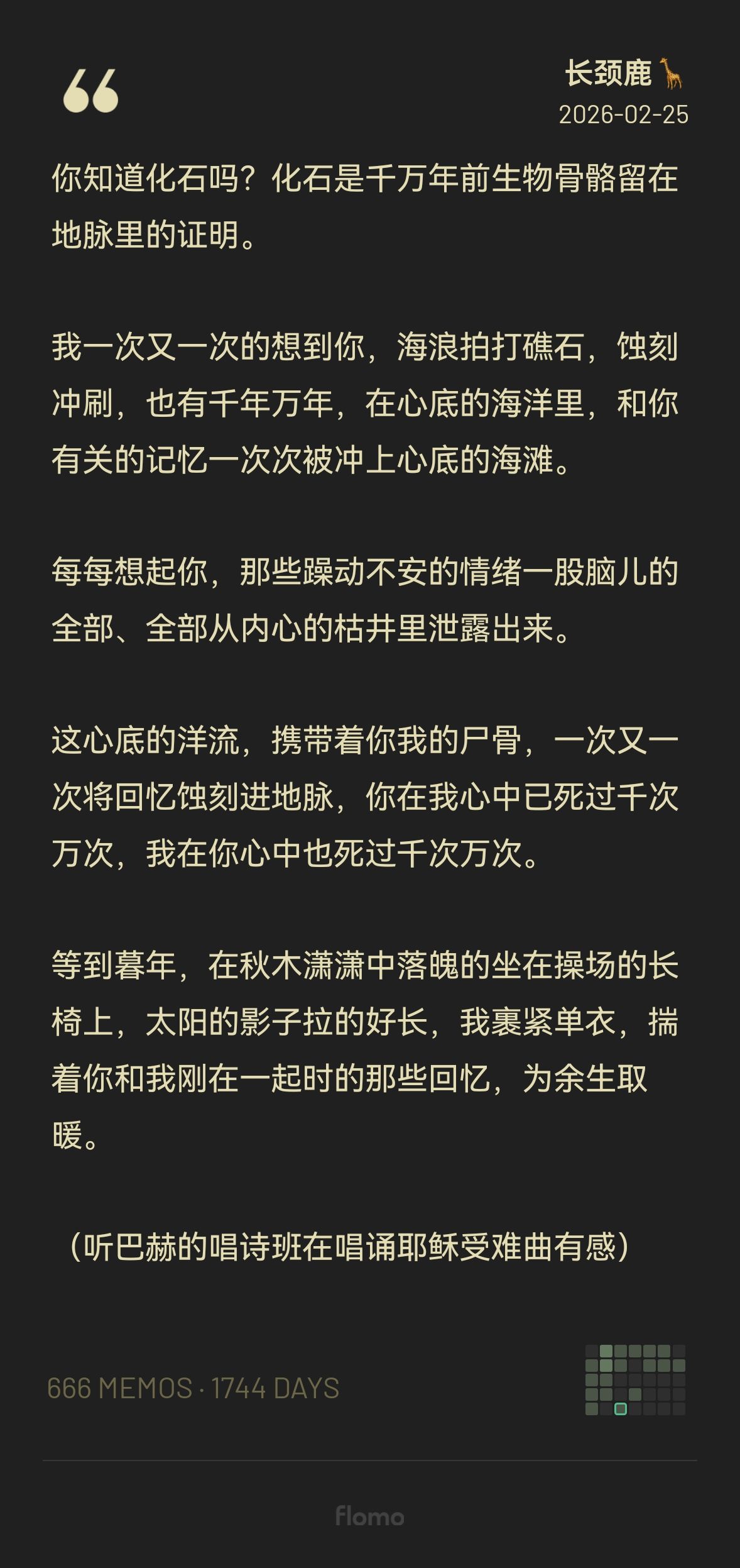 这心底的洋流,携带着你我的尸骨,一次又一次将回忆蚀刻进地脉,你在我心中已死过千次万次,我在你心中也死过千次万次。