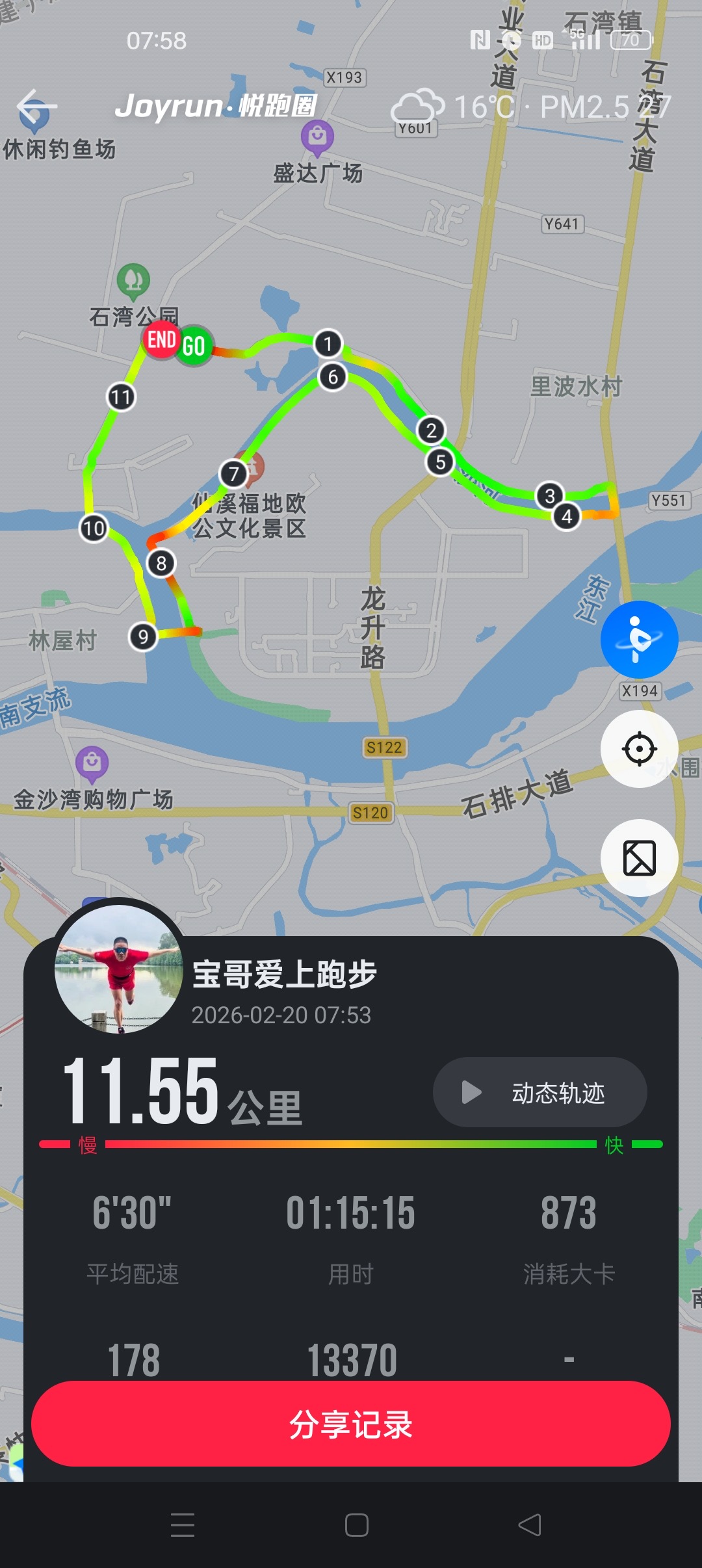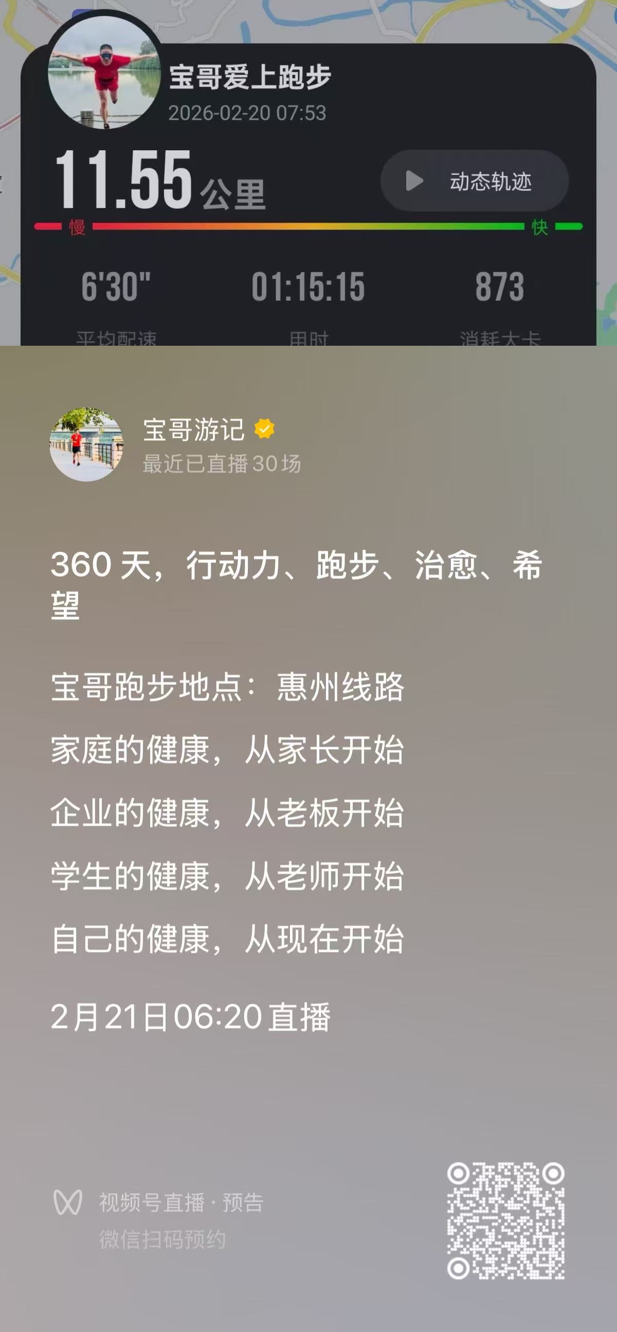 今天是2026年大年初四,也是宝哥坚持跑步直播的第359天,今天我从惠州石湾跑过里波水,一直绕向石龙,一共跑了11.55公里,配速是6分30秒。今天这路跑得心里特别热乎,因为直播间里连线了我亲姐,咱姐弟俩用家乡土话足足拉了一个多小时的话,听着那亲切的牙曲方言,感觉浑身都是劲儿。