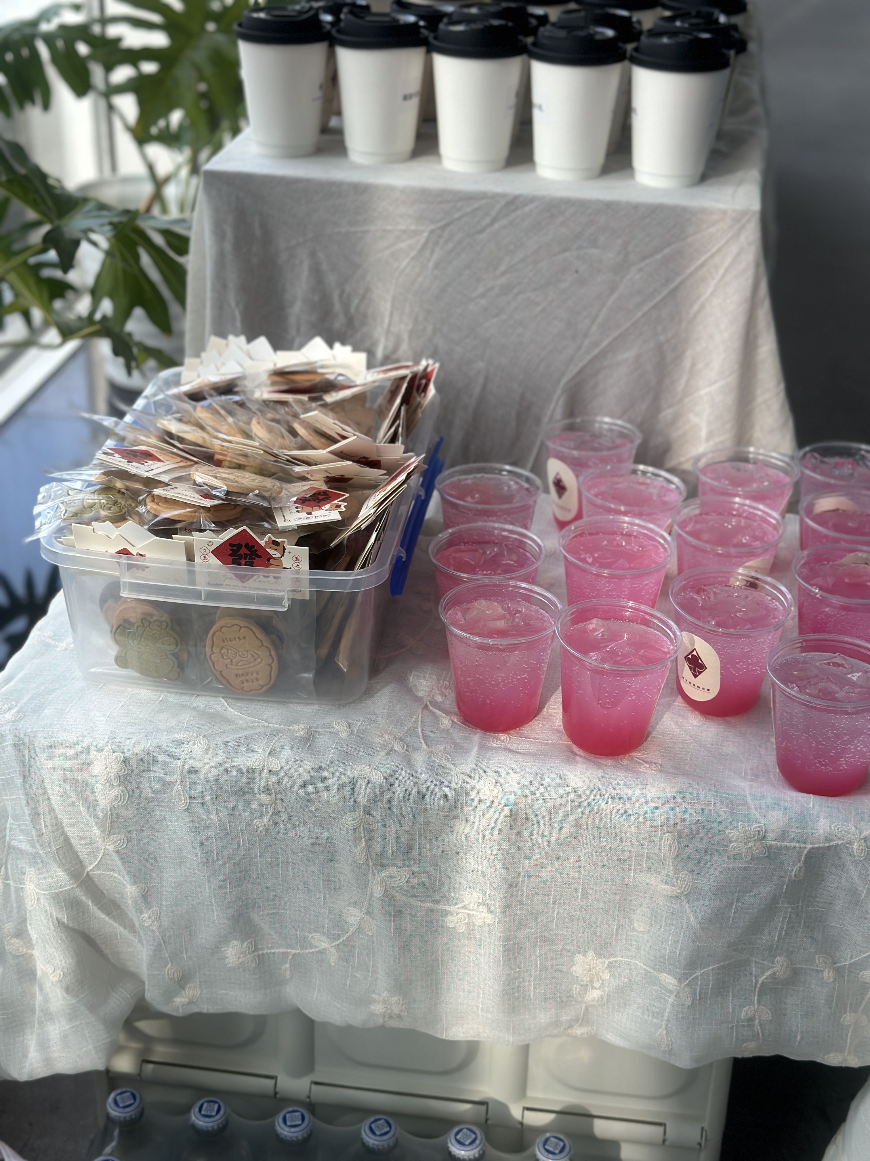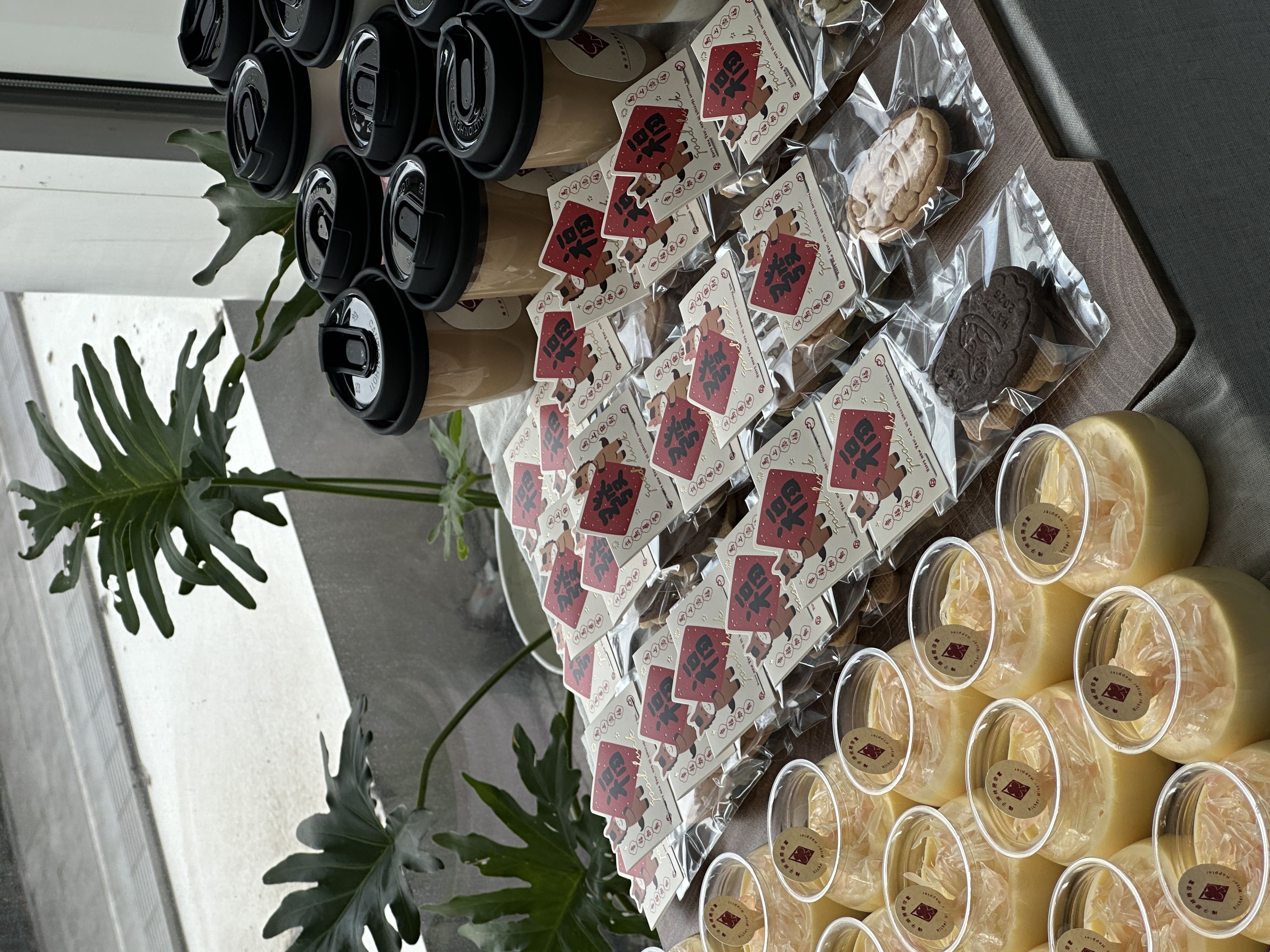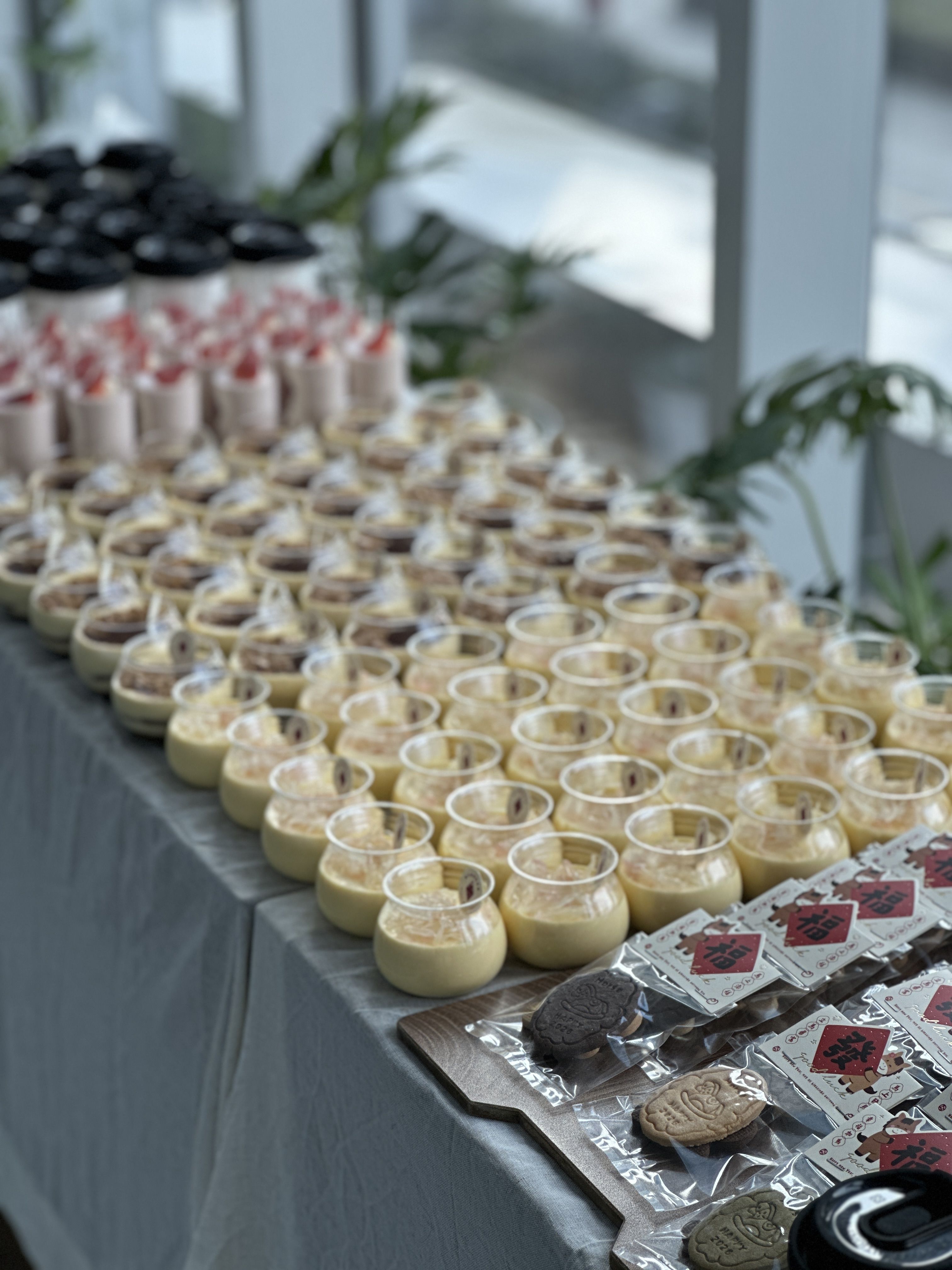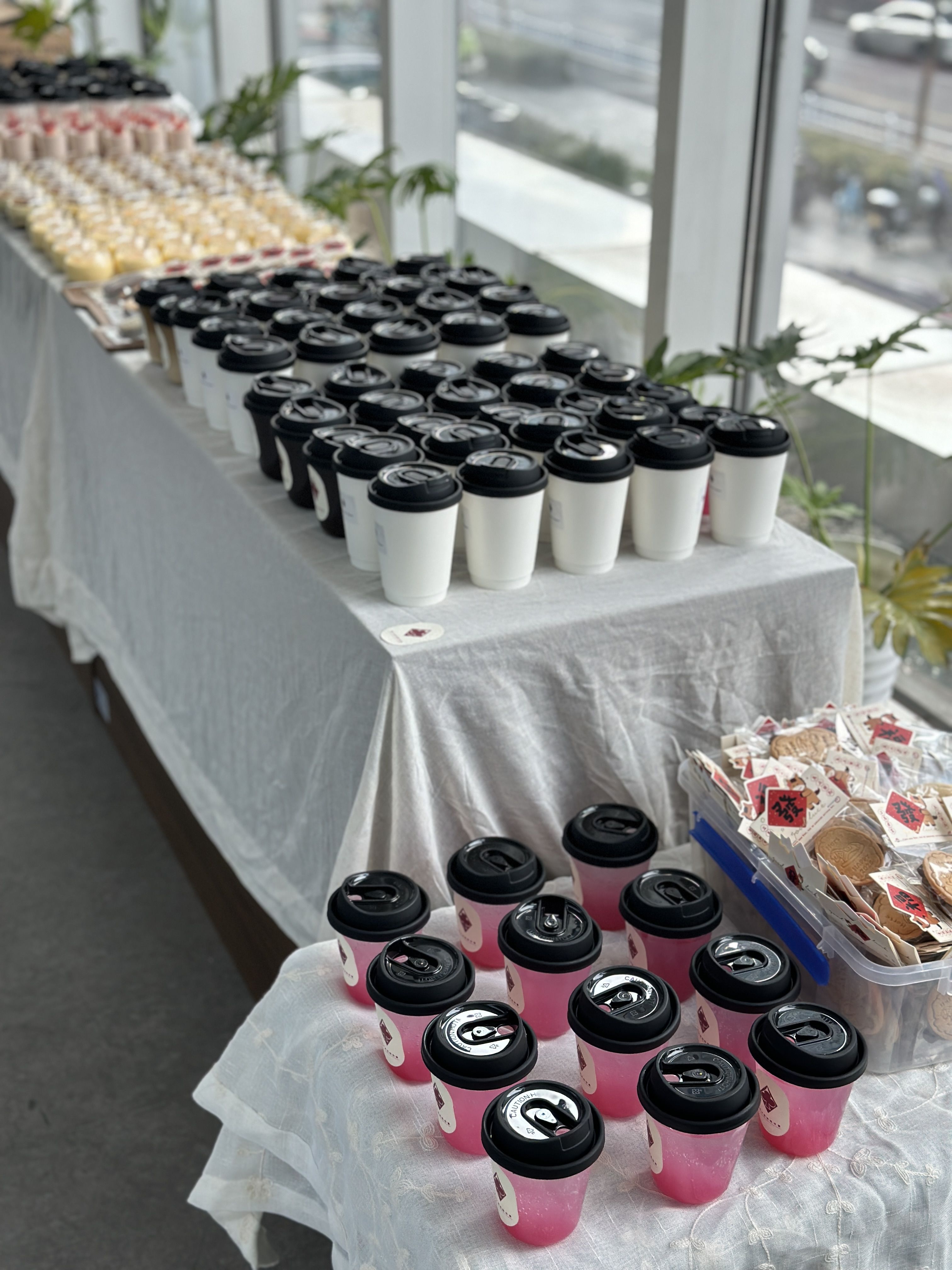 这次是一场中型活动茶歇。人数100人左右,但希望整体呈现完整、舒适、有秩序。我们负责整套茶歇内容与现场布置。包含:手作蛋糕、现制饮品、手工饼干、伴手礼等。