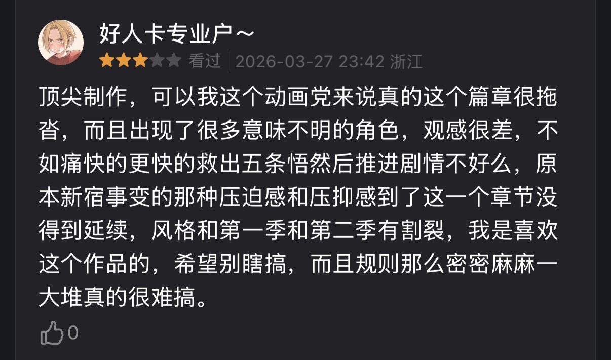 咒术第三季有些偏离热血日漫了,拉跨的叙事能力+足够复杂绕口的设定+尽力的制作组共同造就了一个与前几季风格完全割裂的大逃杀背景艺术性影像。导致观众 cpu 干烧只能选择进行视觉艺术鉴赏…