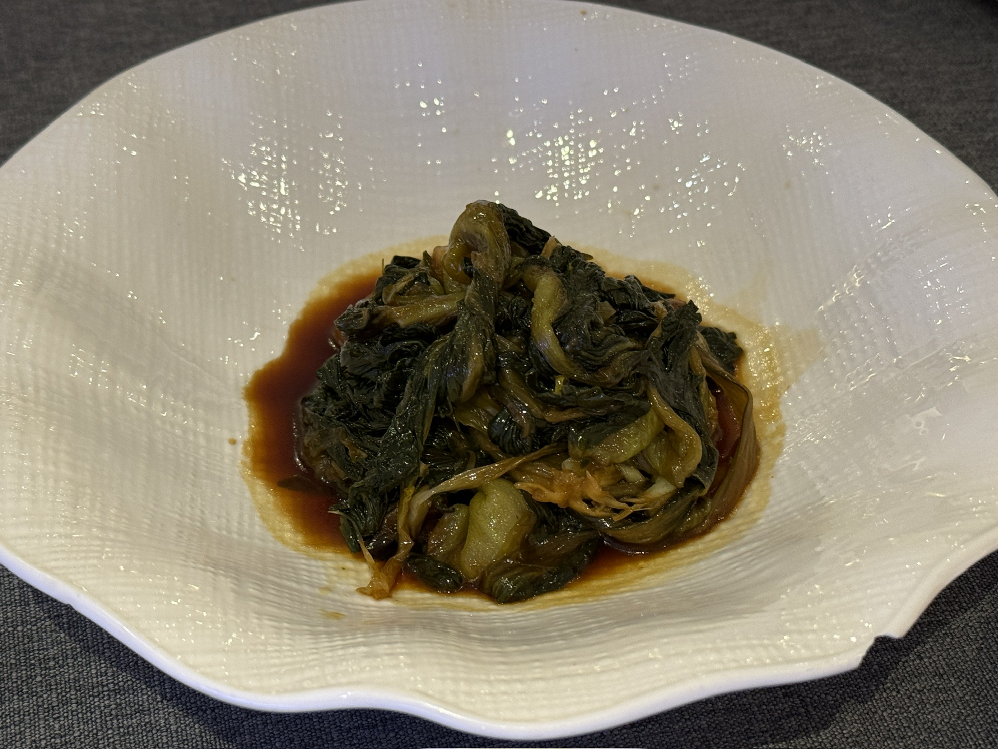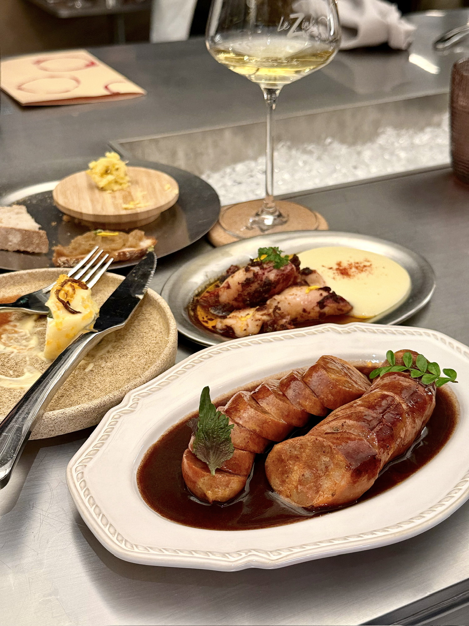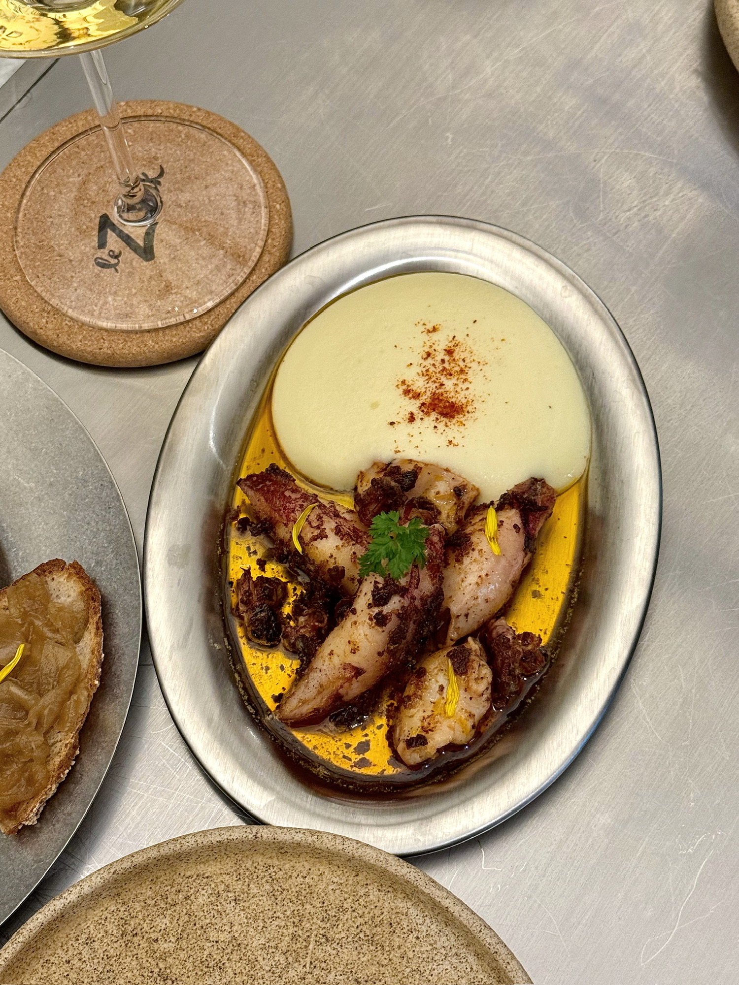 油煎小鱿鱼是大道至简的美味,嚼感真好,脆韧回弹,烟熏火燎的焦香气浓重,土豆慕斯轻盈绵密。