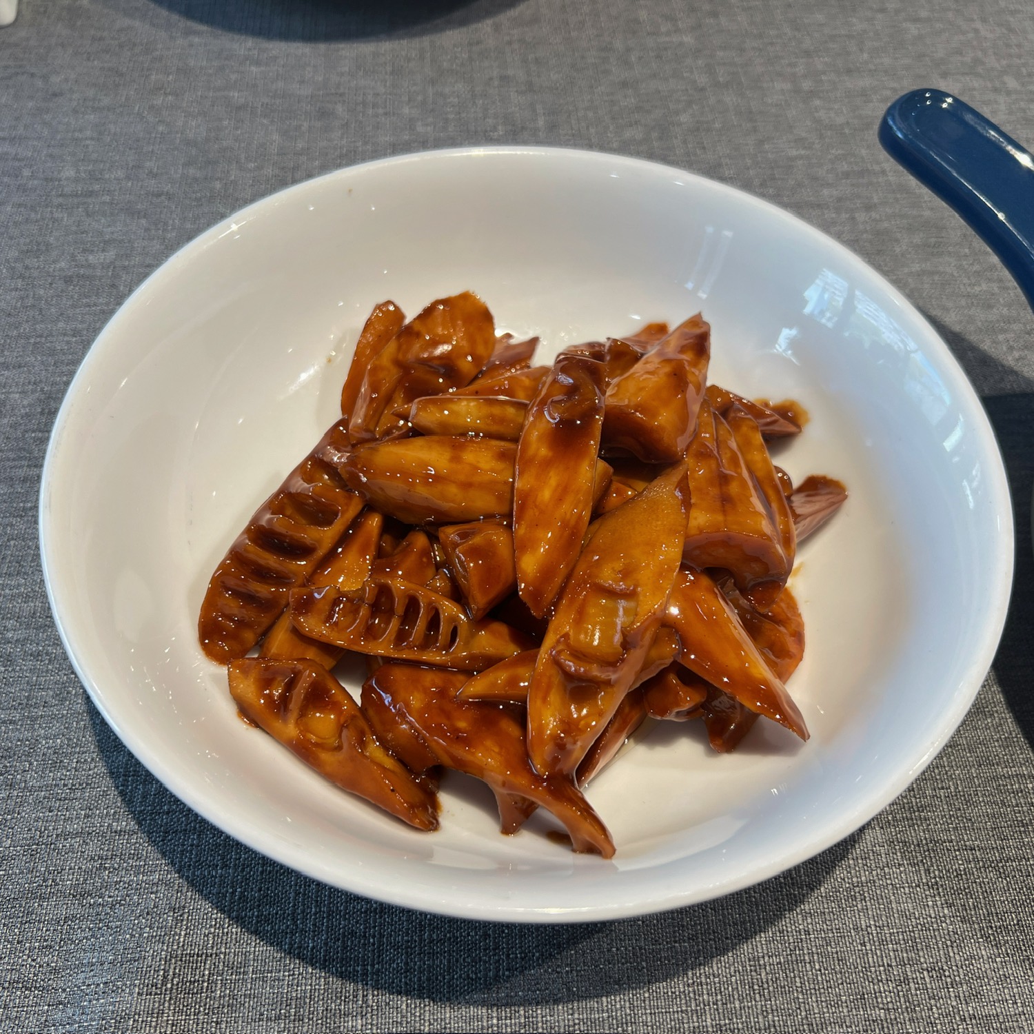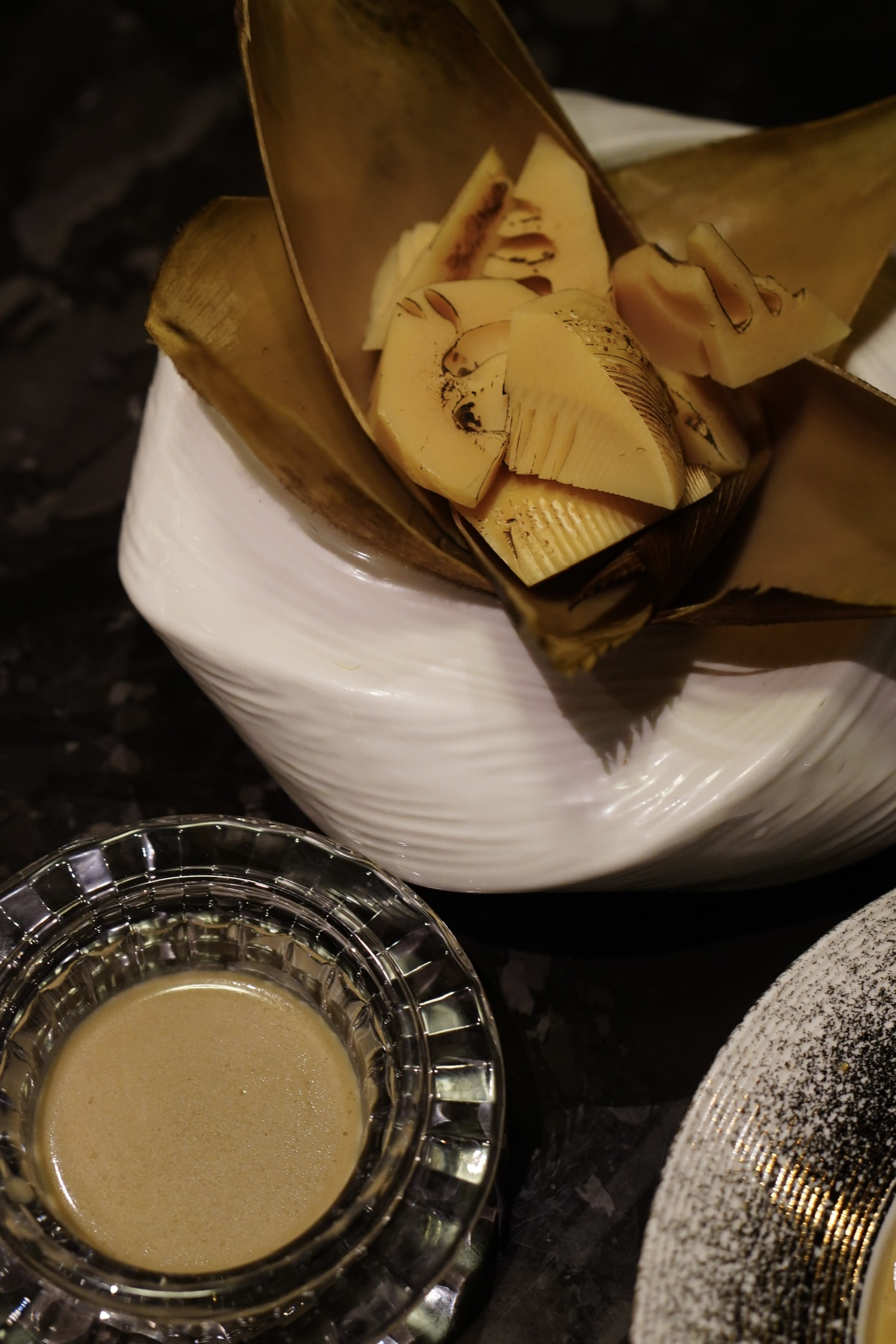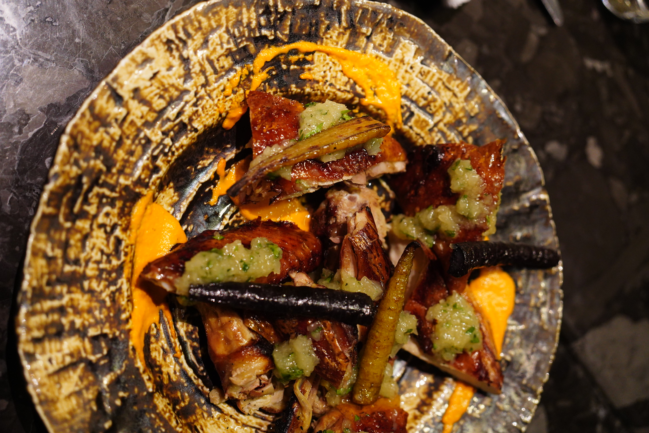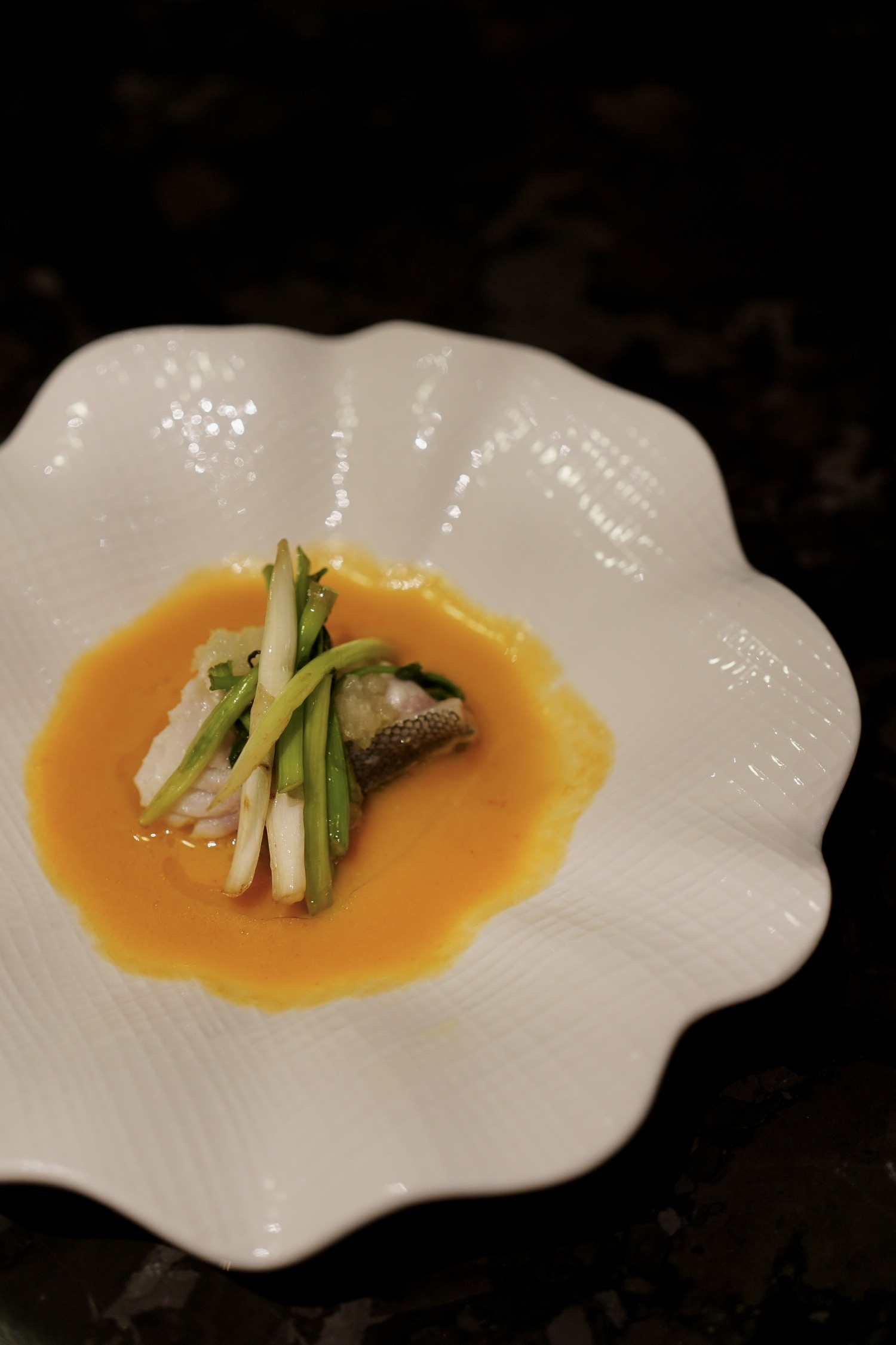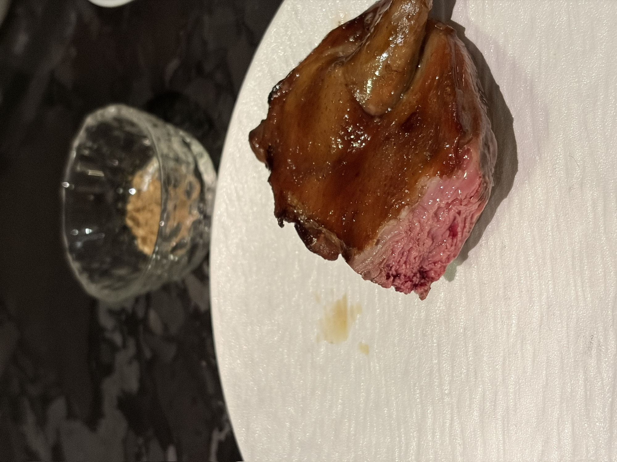 熟成鸭胸肉紧嫩有劲道,鸭皮以为会是油酥松脆,其实更多是焦与韧,酱汁浓缩进了鸭骨与鸭肝的本味禽鲜,鸭肉部分处理得美味。
